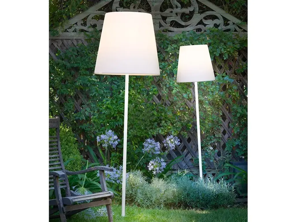 Fiaccola Ali Baba is a particular floor lamp, ideal to give a touch of luminous elegance to gardens and outdoor areas, thanks to the earth spike to plant in the ground. The polyethylene lampshade is made richer thanks to the arabesque texture on the surface, which is the main feature of the whole Ali Baba collection. The base is in galvanized metal, makes it waterproof. So Fiaccola Ali Baba is suitable for every kind of setting, ad private gardens, contract and events.Structure finish- Silver steel- Matt white lacqueredLighting- E27 - 1 x 10W- RGBW LED included
