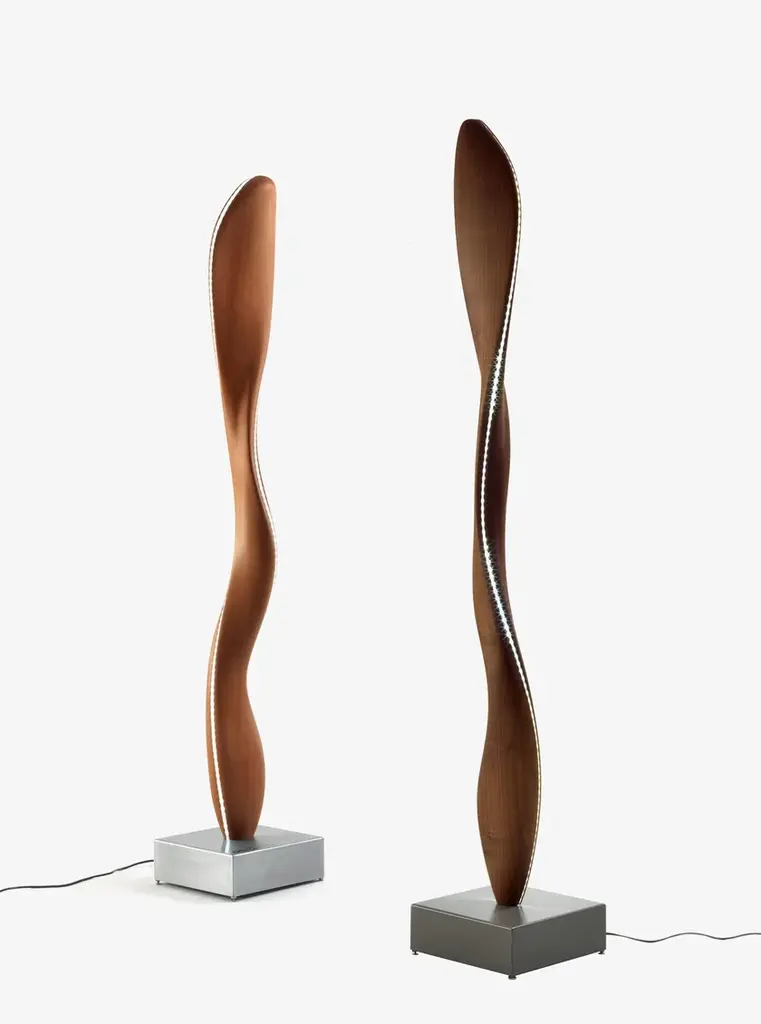 FIAMMA LAMP is a floor lamp with a sculptural design, entirely crafted from solid wood, carved from a single block. Two LED strips run along the outer edges, creating an atmospheric light. The base is made of squared iron.