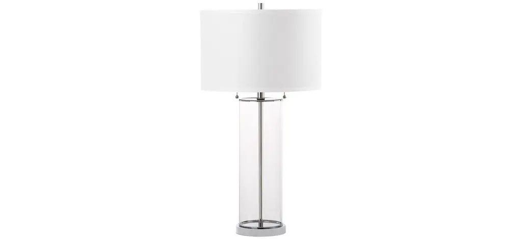 Fineas Contemporary Floor LampFeaturesNumber of bulb: 1Bulb type: AMax wattage: 150WVoltage: 120VSocket: Medium Plated Sheet E26Switch: Hi-LoSwitch location: SocketFinish: Clear Glass and Polished NickelShade: Ascot White Fabric ShadeCord color: SilverUL listed: DryDimensionsShade dimensions: 20 inches top x 20.5 inches bottom x 13 inches down sideBase dimensions: 1 inch height x 11 inches width x 11 inches depth