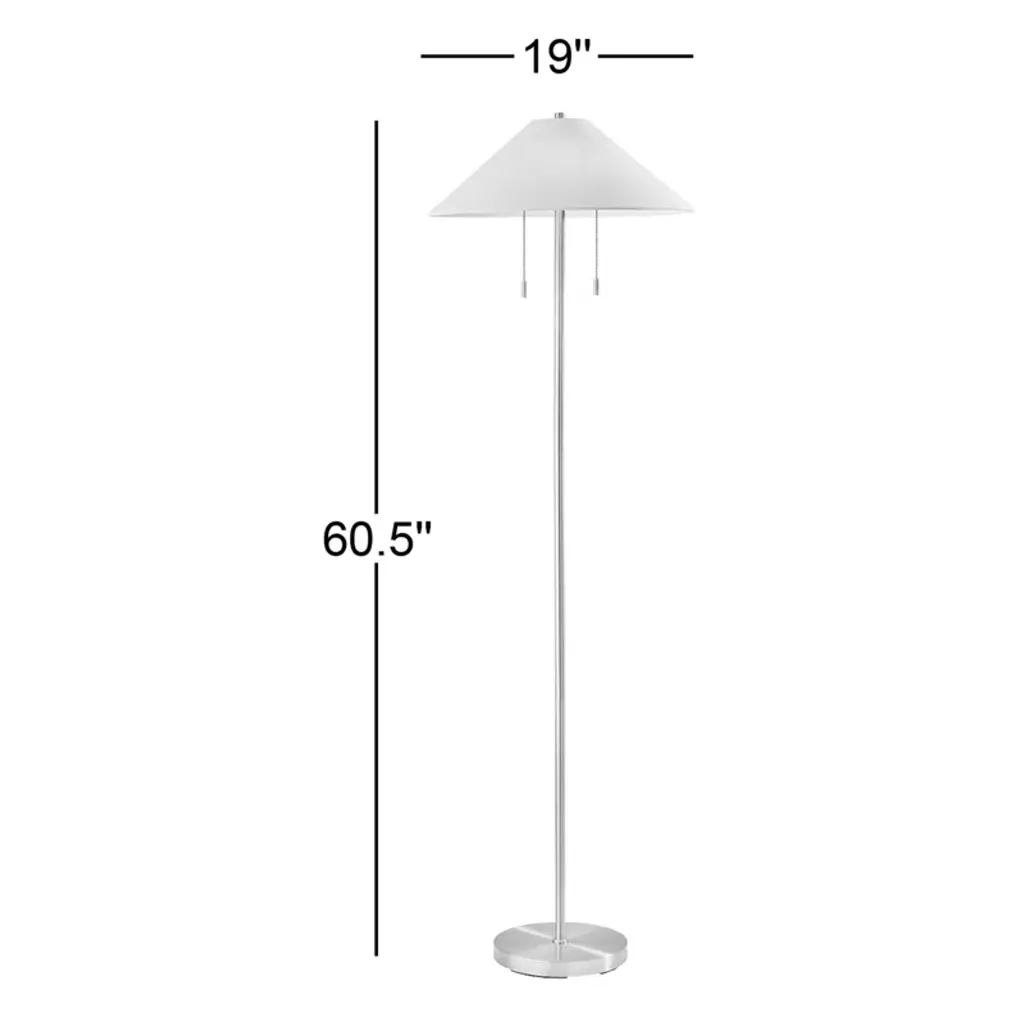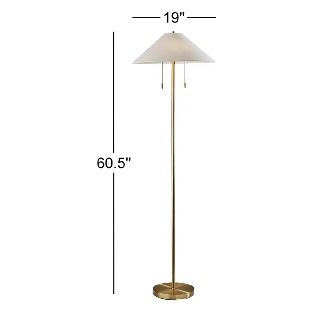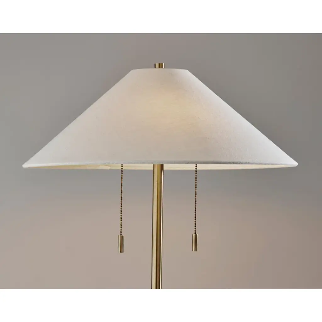 Introducing the Nassim floor lamp, a beacon of timeless elegance that brings a touch of refinement to any room. Finished in luxurious brass, this floor lamp exudes sophistication and style. The Nassim boasts an off-white fabric shade with a striking tapered design, making it a statement piece that enhances your decor. The convenience of on/off pull chain switches on each socket adds a classic touch while giving you full control over the lighting ambiance. Elevate your living space with the Nassim floor lamp, where form meets function in perfect harmony.