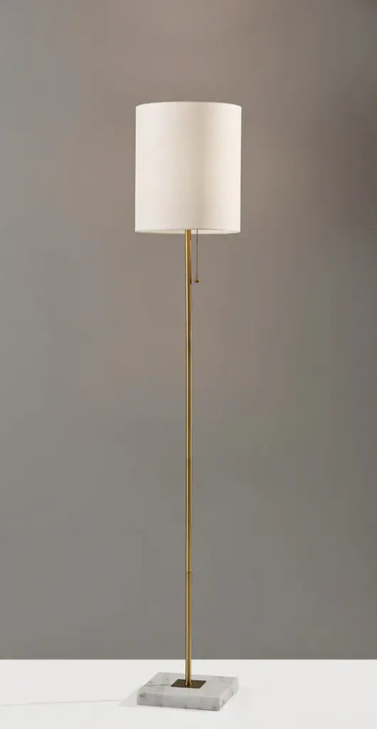 A simple silhouette is updated with high quality materials with the Fiona Floor Lamp. A square, white marble base keeps the lamp sturdy and strong while adding elegance to the look. Antique brass metal is softened with a white fabric shade that reveals its beautiful subtle texture when lit. Turn the lamp on and off with a simple tug of the pull chain switch. A clear, barely there cord trails neatly from the base.