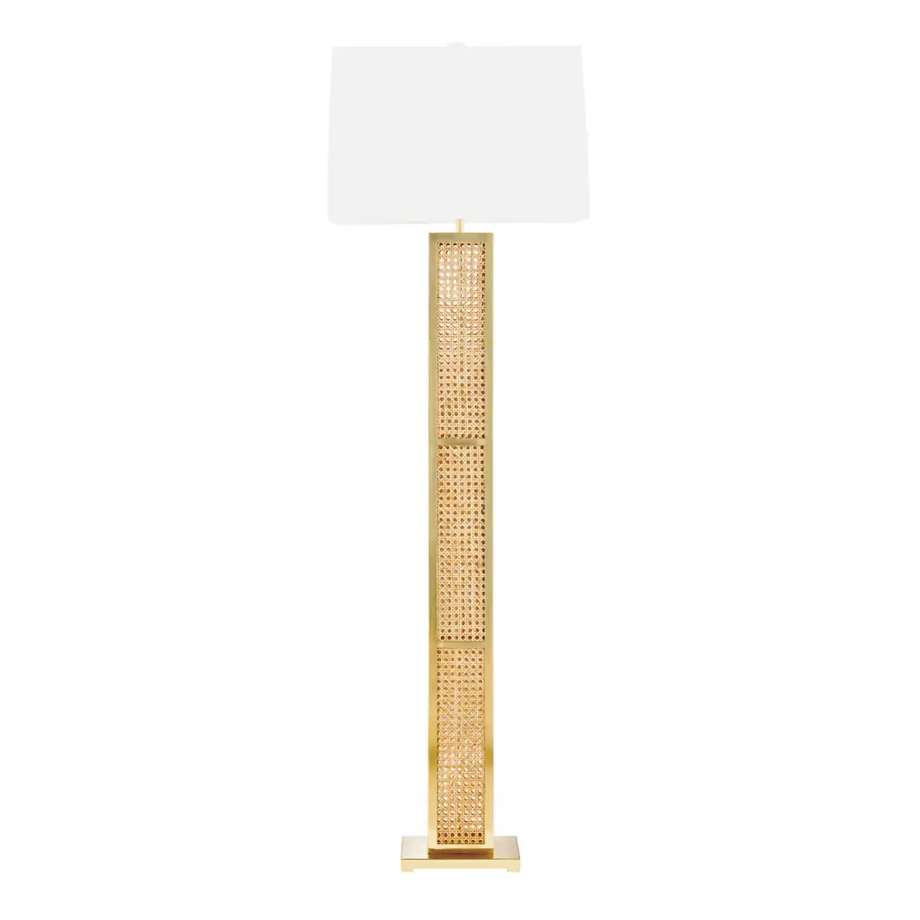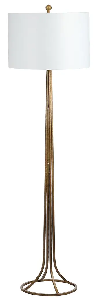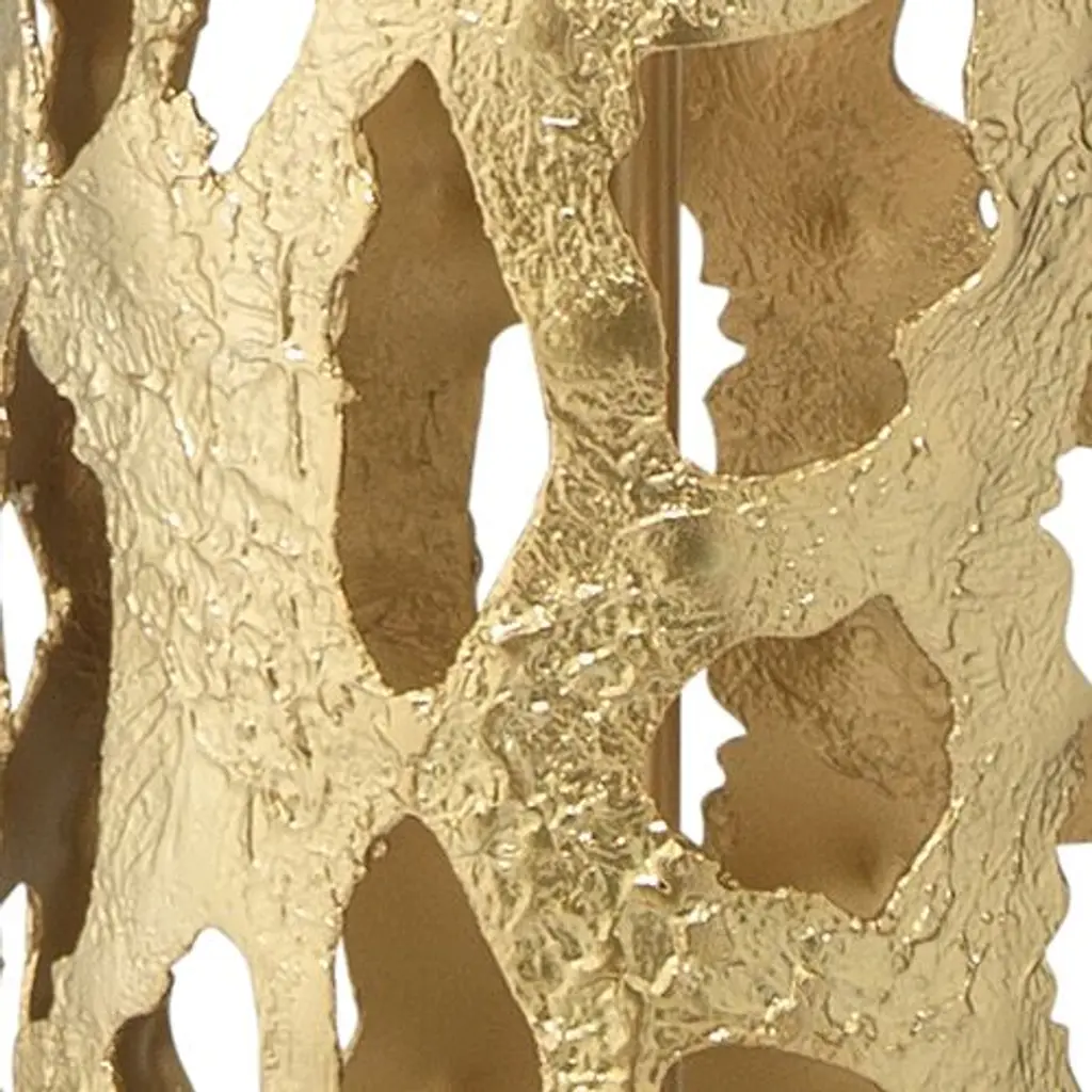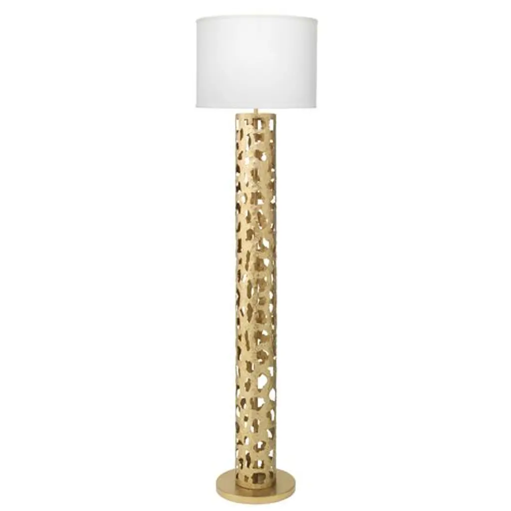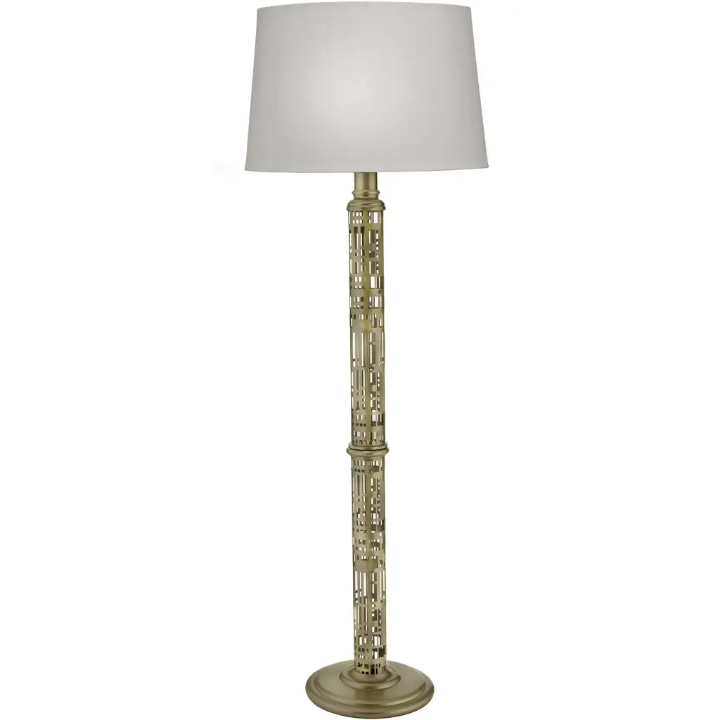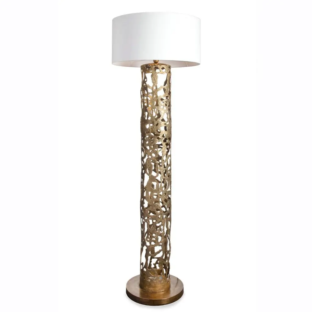 Lacy cutouts give the body of this floor lamp the appearance of delicacy that is belied by its plasterlike texture and metal construction. Crafted and finished by hand, the lamp is topped with an elegant linen shade.