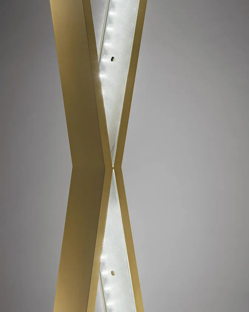 Please note that VAT is not included in the price.A willowy brass X of which inner sides contain 12 LEDS, covered by sophisticated diamond cut glasses. Able to function as either a floor lamp or a suspension lamp, it has generous dimensions and undeniable originality, with the light sources as an integral part of the structure.Michele Reginaldi graduated from the IUAV architectural University in Venice in 1982. After graduation he moved to Milan where he has since lived and worked. Collaborator of the architectural firm Gregotti Associati, he became an associate in 1990 and then partner in 1998. In 1982 he opened his Quattroassociati office in Milan and in 2012 the RDY Milan-Shanghai Architecture Studio. His design activity is well documented in various books and magazines devoted to his two Milanese design studios. Along with his architecture practice, he has since the 1980s also worked as a visual and plastic artist, as documented in three books published by Bolis Edizioni.Additional Information: Color: Anodized Gold; Materials: Anodized aluminium structure. Diffuser in prismatic 4 mm float glass; Purpose: The lamp is indoor use only, diffused light; Light Source: LED Boards, Dimmer Light; Wattage: 36W direct; Voltage: 24 V indirect; Lumen: 3168; Cri: 80; Kelvin: 3000; Dimension: is 540 x 1900 mm.Please note all lamps are supplied with European plugs and 220v. US plugs can be supplied and changed to 110v at the client's request.