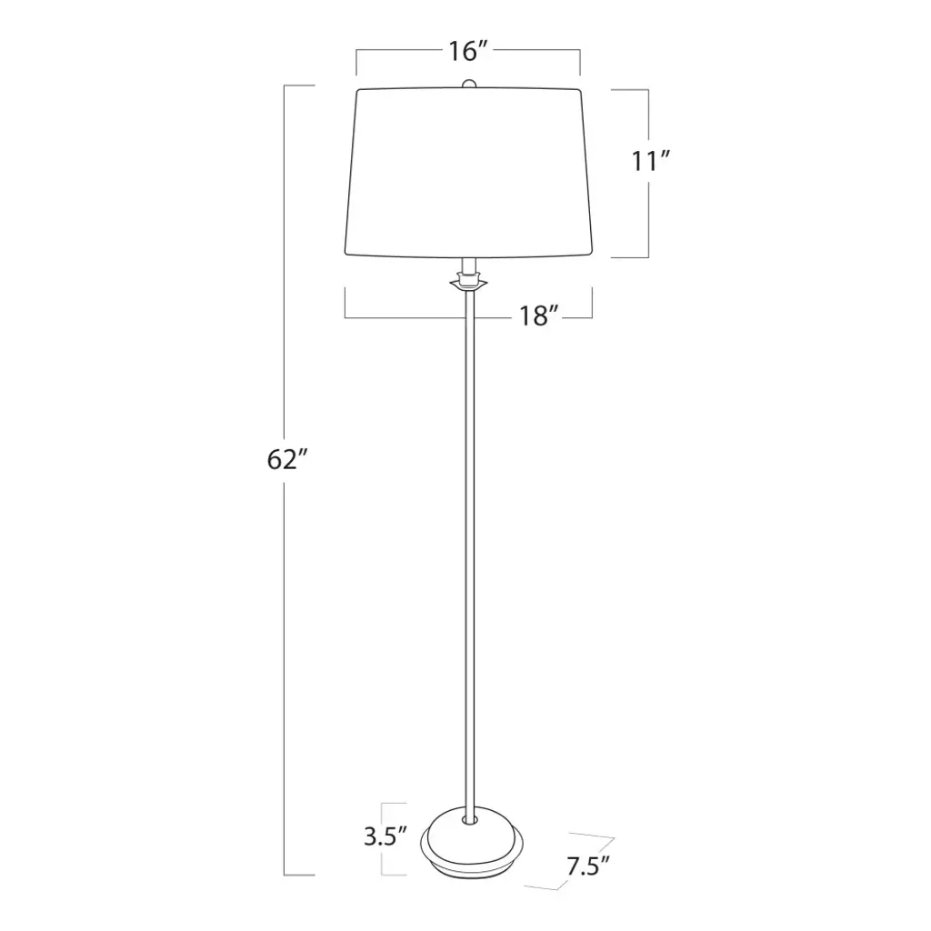 Fisher Floor Lamp; Dimensions 18W x 62H x 18D; Uses two maximum 100 Watt E26 Base Bulbs (Not Included). CSA/UL Certified. Dry rated. Plug-in