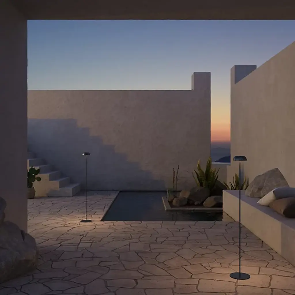 Minimal and multifunctional. While the Float Rechargeable LED Floor Lamp from Axolight appears like a simple and straightforward floor lamp at first glance, this fixture offers a smart and sophisticated functionality ideal for any environment. A flat base steadies its slender steel body as it rises to a rounded aluminum shade. Its integrated LED can be charged and emit up to 9 hours of light while a soft-touch top controls its five dimmer settings.