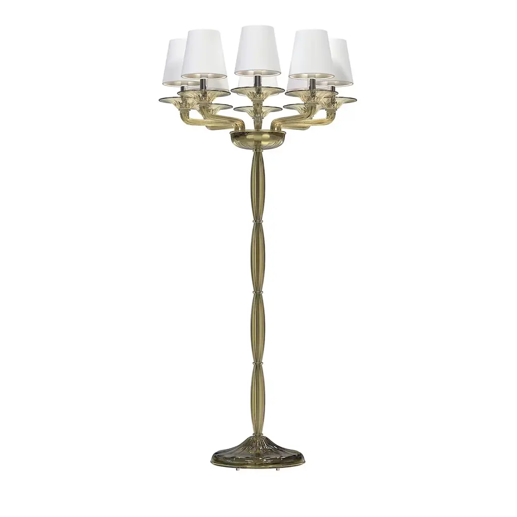 The Alessandro Floor Lamp is a striking handcrafted lighting fixture for any room of your home. Perfect floor lamp for the living room, bedroom, den and office. Hand-blown opaque glass shapes in are set onto a brass pole coiled with copper and set into a brass base with copper inlay. The curvy asymmetrical lamp shade is covered with a sheer, soft green fabric with a leaf design. The lamp has a single bulb socket and is finished with a beaded pull and a finial. Handcrafted in the USA! This fixture usually ships in 2-4 weeks. This item ships for free to the lower 48 states. • • Please note that the price listed pertains to a fixture that will appear very similar to the light shown in the featured photograph and as outlined in the accompanying description. Made with UL Listed parts. For use with a single standard incandescent lightbulb of up to 60-watt max (included). Can be used with an LED lightbulb of up to 100-watt max.