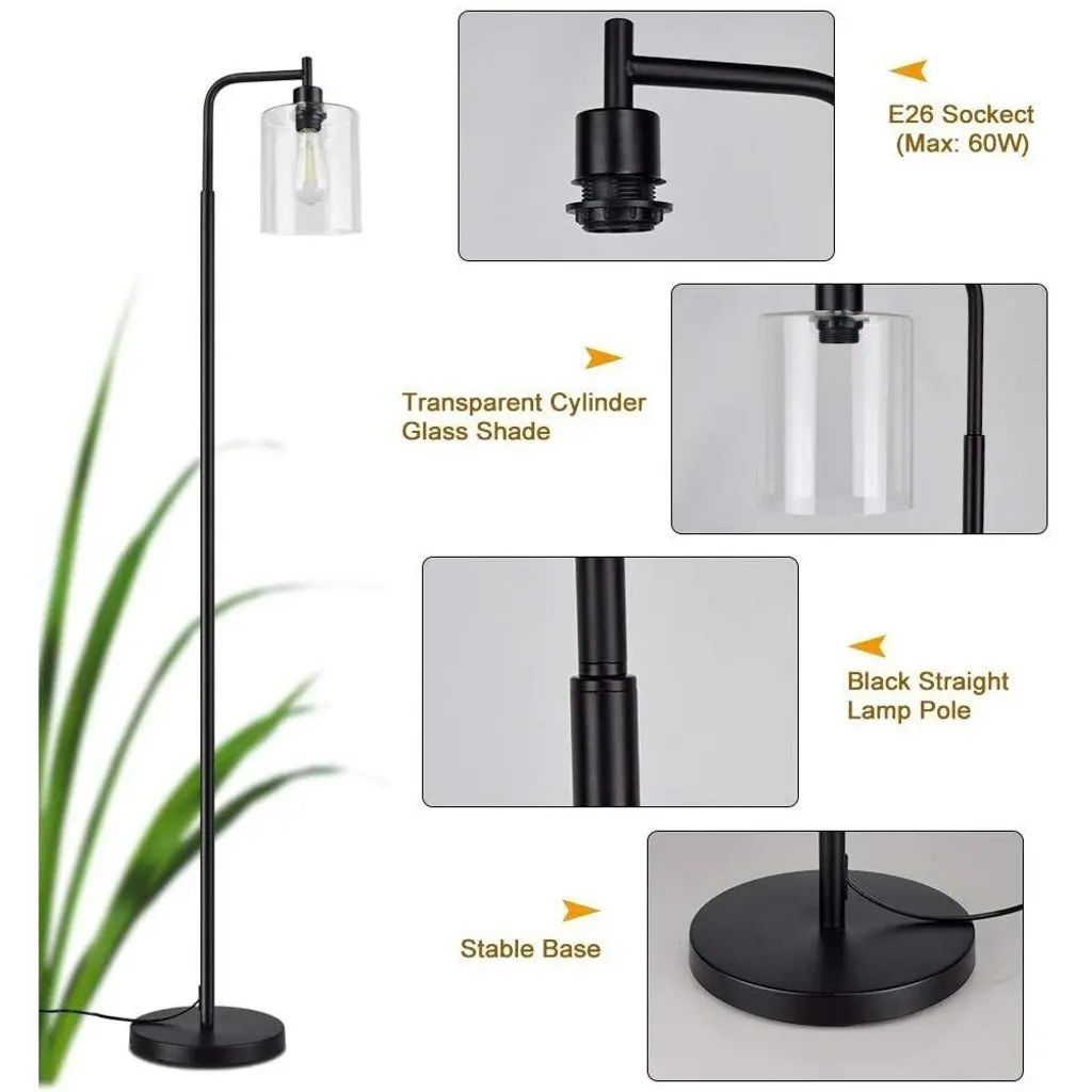 ABOUT THIS ITEM:BLACK -ROUND BASE Various Application The minimal design takes up the least space, and led floor lamp can be placed wherever you need. You can use it as a bedside reading lamp, living room lamp, floor reading lamp or office standing lamp, the hanging glass lampshade and black straight rod to add a retro look to your living room or bedroom. Create Your Own Style 63'' standing lamp is built into E26 standard base socket. You can use different shapes of any E26 basic bulb to customize your stylish lamp to create your own decoration. The light fixture is compatible with various LED or incandescent bulbs (maximum 60W-Included a 8W Warm White Bulb which is equivalent to about a 60w incandescent bulb and gives plenty of lights with using less watts of power. ) Easy to Assemble and Move All you need to do is to screw all the parts of the lamp pole together according to the instructions. With detailed instructions and all hardware, it can be installed quickly and easily. The 6-foot cord allows you to place the decorative floor lamp wherever you want. Stable & Safety The sturdy metal rod and solid round base can firmly support the tall pole light, not easy to tip, and the stable and durable vertical indoor floor lamp can protect the safety of children and pets. Specifications -Voltage:110-120V AC -Power Max.:60W -Bulb Socket: E26 -Material:Metal+Glass -Power Source: corded-electric Package Contents 1*Floor lamp 1*8W Warm White Bulb 1*User manual TIPS 1.This standing tall downlight is not a toy and don't let children play with the floor lamp. 3.Need to install by yourself, it is recommended to assemble the lamp shade first, then assemble the lamp pole from top to bottom, and finally install the lamp base.