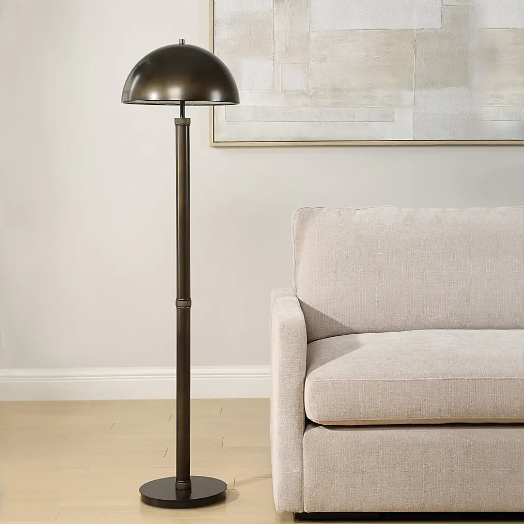 Illuminate your space with sophistication and style with this rich dark bronze floor lamp. A diamond knurl pattern adorns the lamp''s simple profile, adding a touch of refined texture. A beautiful dome shaped metal shade tops the all metal body, casting a