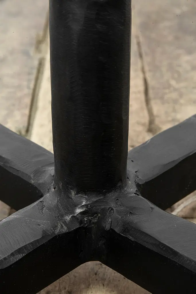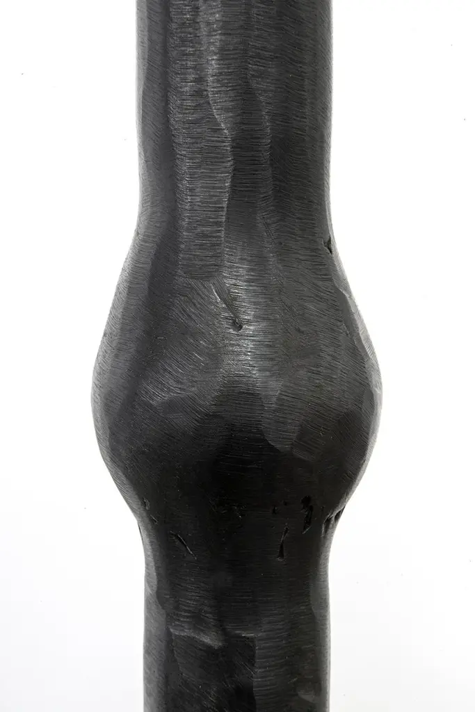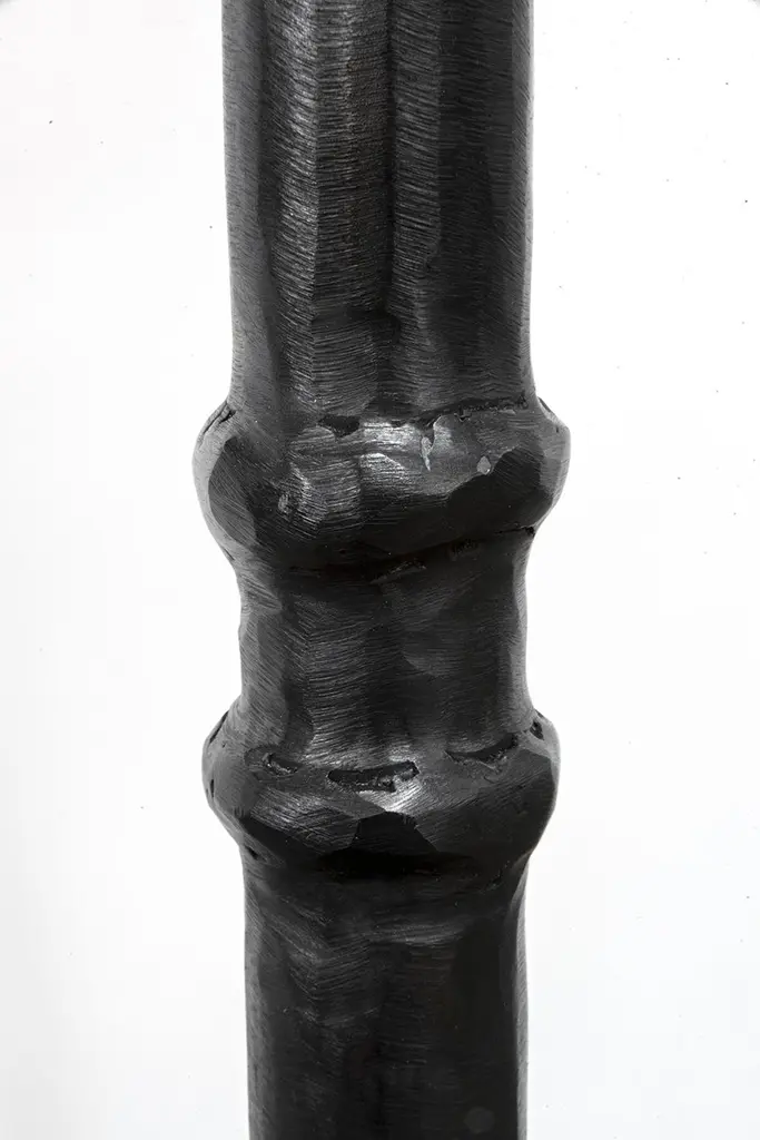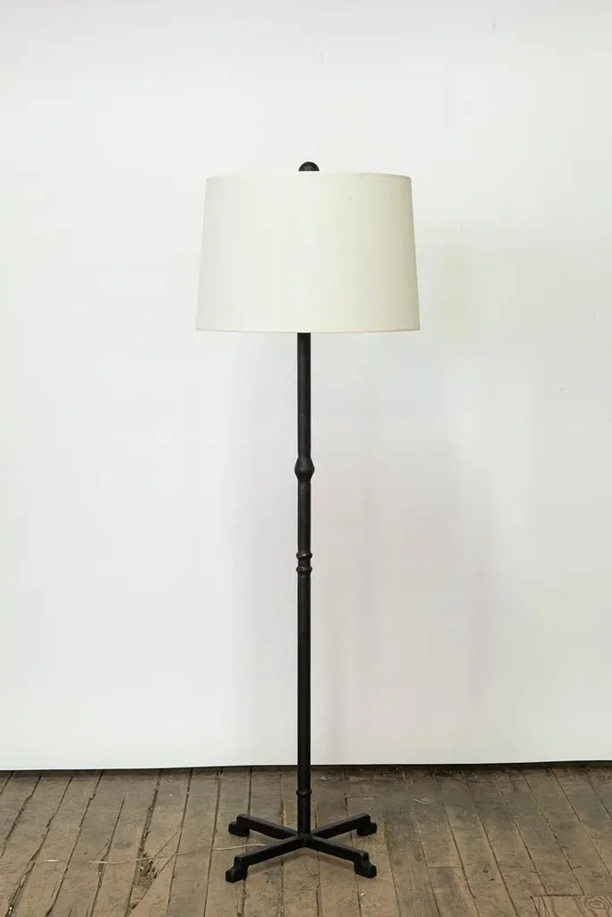 Lamp No. 5 J.M. SzymanskiD. 2022This special floor lamp features a linen shade and a carved steel base. A single A unique take on a classic look, this simple lamp features a custom linen shade and elegant steel embellishments. While details like the hand-carved feet and the hand shaped finial may be simple, they speak volumes.Custom sizes available. Made in the Bronx, New York, USA.Our products are fabricated and finished by hand, so variations in size, shape, and patina color are a natural result of this process. Tooling marks and surface scratches are part of the character of many finished pieces. All products are sealed with oil and wax, which, over time, are not impervious to moisture. Our blackened steel pieces installed outside or in areas exposed to moisture indoors, especially in marine environments, will rust. Condensation from hot and cold drinks will leave rings on blackened steel table tops. Coasters or placemats can protect the finish. Periodic maintenance of blackened steel items may be required.