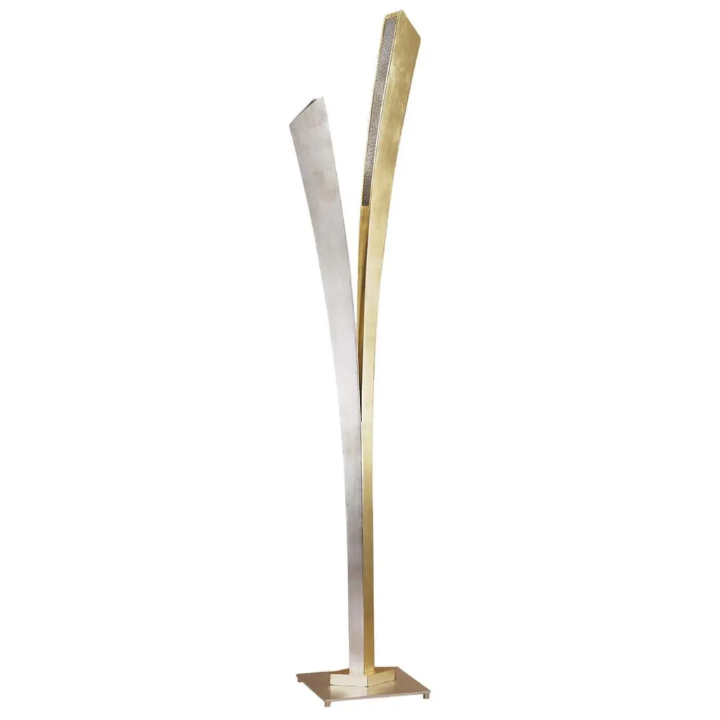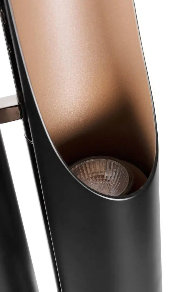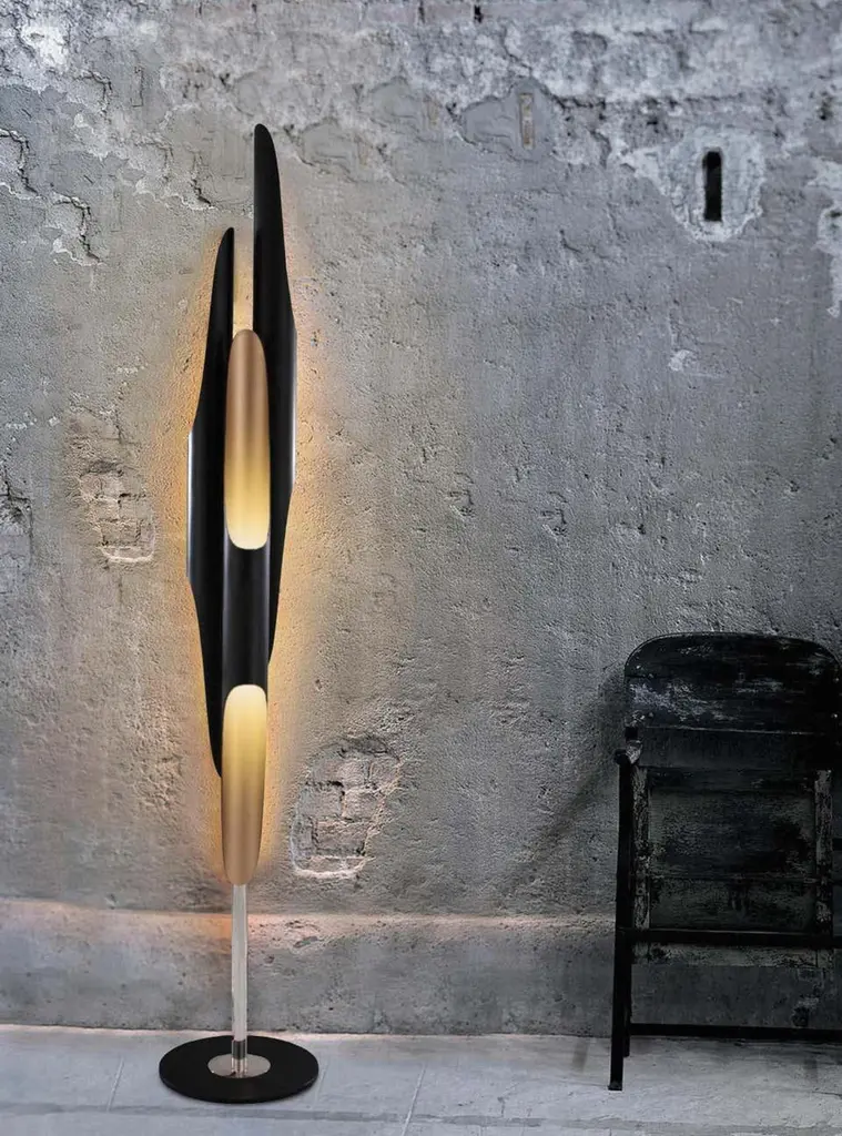 Floor lamp in black and steel.6 x G09 bulbs (included) (for USA not included) max 40W per bulbDimensions:Height 68.9 in. (175 cm)Diameter 11.82 in. (30 cm)Handmade in brass and aluminum, the minimal black floor lamp has a matte black finish on the three lamp shades with a gold powder paint on the inside, that provide a smooth lighting effect.Please inquire for available variations in color and size.Estimated production time: 6-7 weeks.