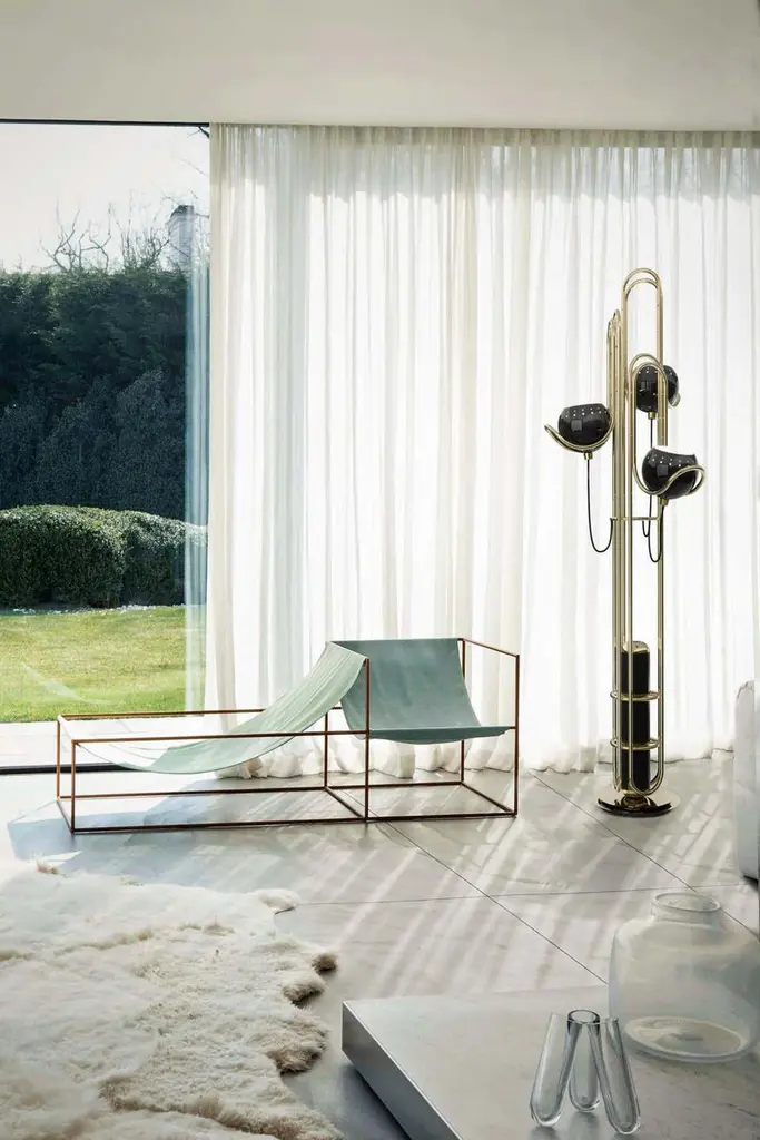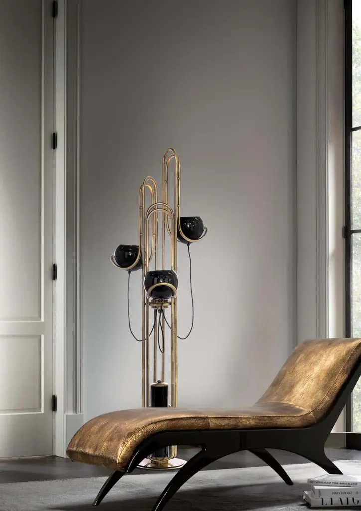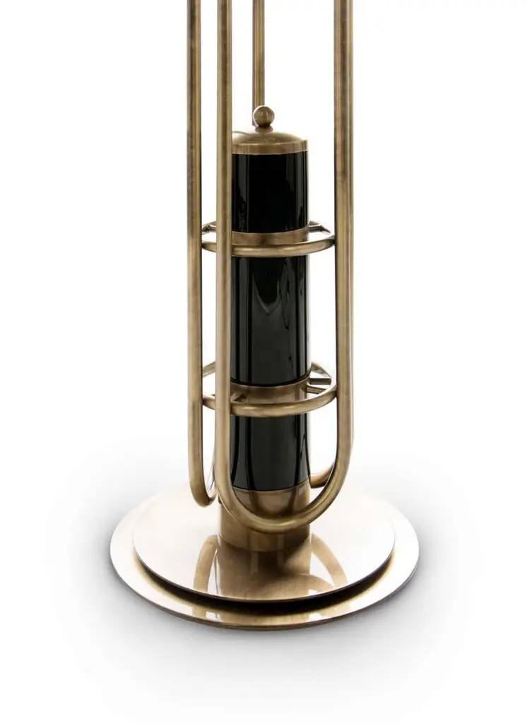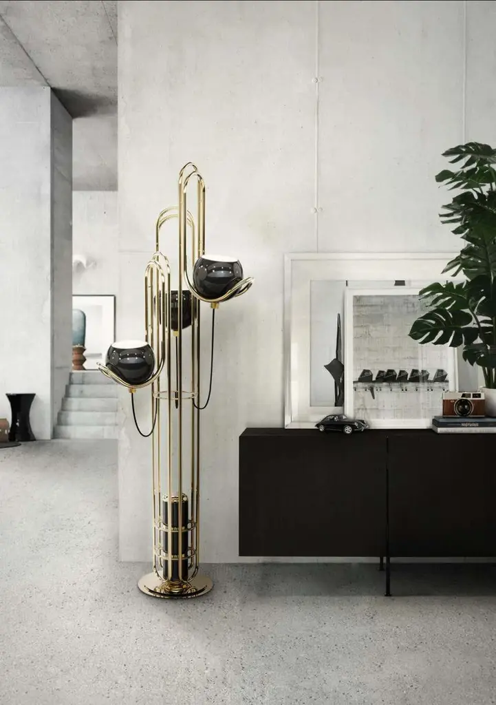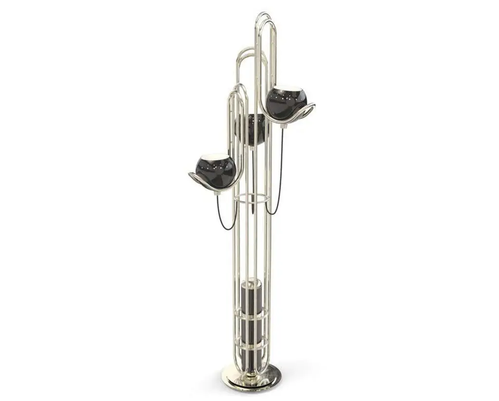 Floor lamp in copper with black globesEstimated production time: 6-7 weeksDimensionsHeight 27.29 in. (69.3 cm)Diameter 10.24 in. (26 cm)The gold-plated body is the ultimate detail in this retro floor lamp. Handmade in brass tubing using a Classic method of bending the brass twice into a rounded oblong shape that allows for bright and load casts of light holding spherical diffusers with a retro design.3 x E27 Bulbs (included) (E26 for USA not included) max 40W per bulb.