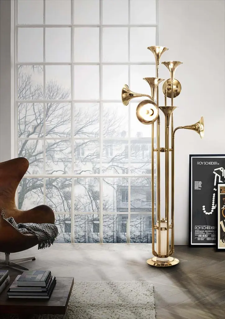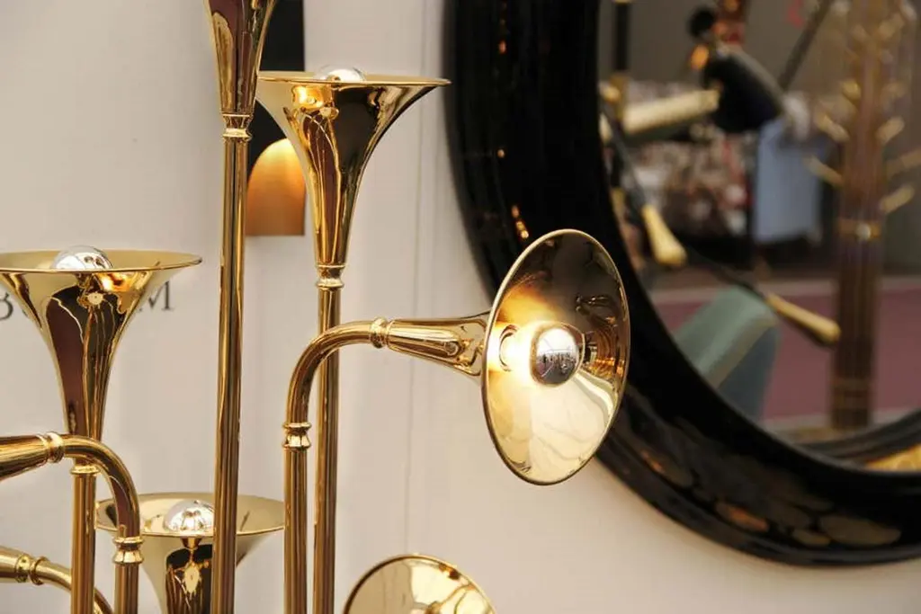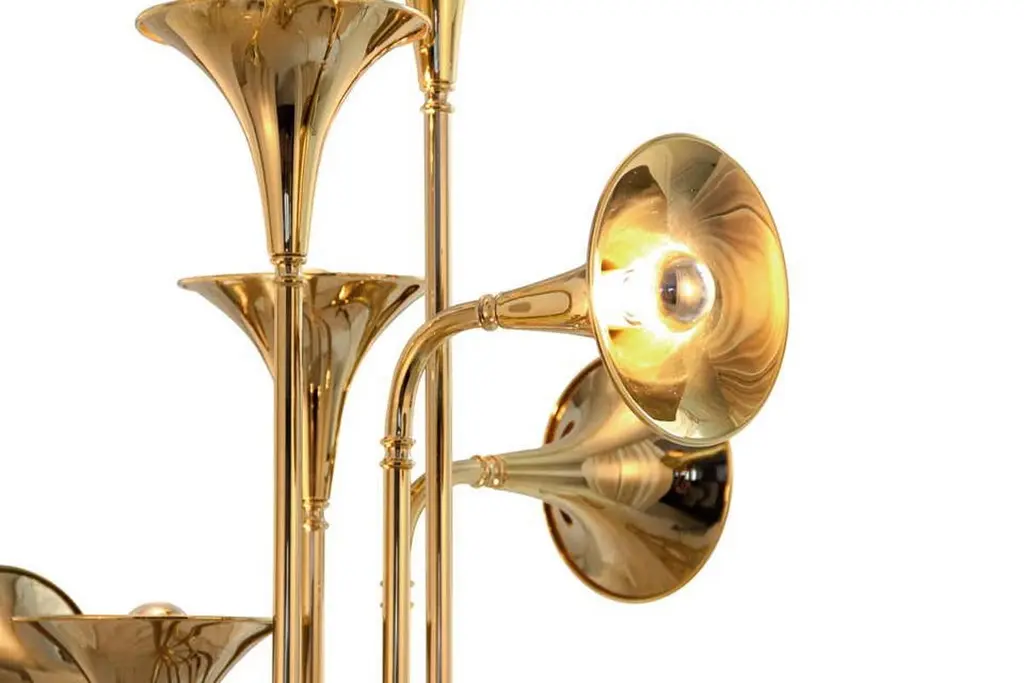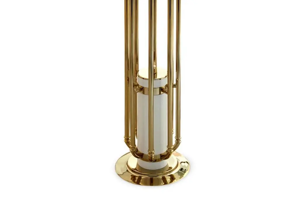 Floor lamp in gold and brassEstimated production time: 6-7 weeksDimensions:Height 70.87 in. (180 cm)Diameter 24.81 in. (63 cm)8 x E14 Bulbs (included) (E12 for USA not included)max 40W per bulbBase: Gold-plated and white glossyBody: Gold-plated.