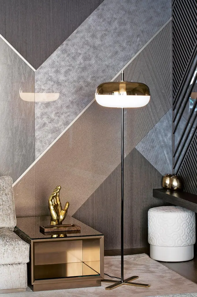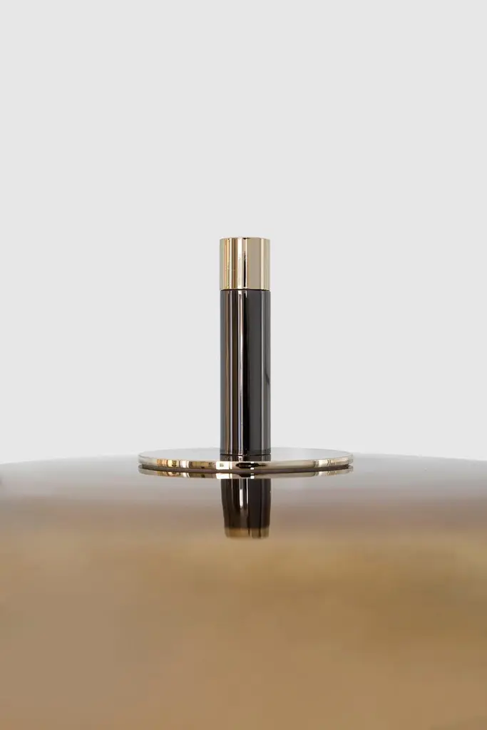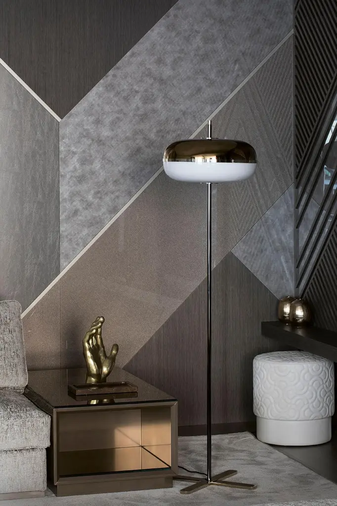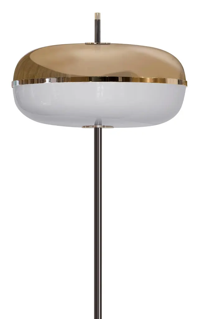 Suspension ceiling lamp, a design object suitable for any environment, from the living room to the bedroom, with metal and blown glass structure.MaterialsCeiling lamp made with metal structure in polished black nickel and polished champagne finish. Decorative blown glass in white opal and bronze mirror finish.