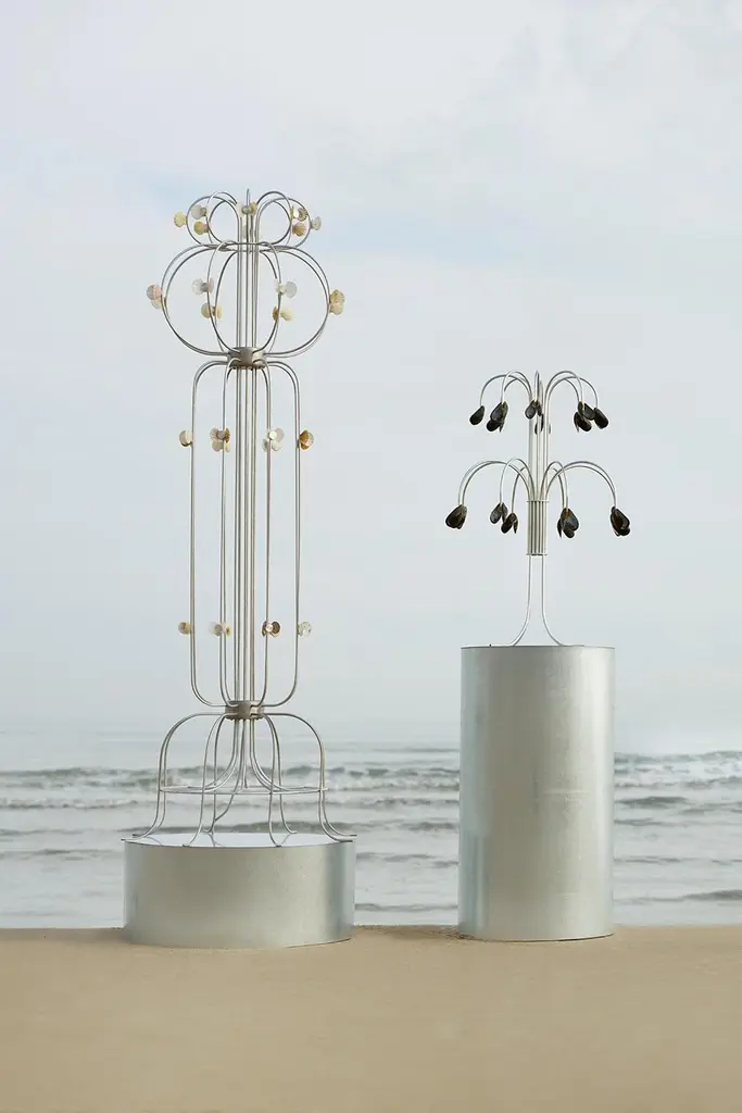 Floor Lamp With The Shells in Metal & Aluminum by Touch With EyesDimensions: D 60 x W 60 x H 165 cmMaterials: Metal and aluminum. Weight: 5 kg. All our lamps can be wired according to each country. If sold to the USA it will be wired for the USA for instance. Please contact us.TOUCH WITH EYES is a duo of designers Alexander Kanygin and Anna Druzhinina.Alexander is an independent product designer who established his own studio in 2004. Anna is a fashion designer, founder of a local brand M_U_R. Both designers participated in various international exhibitions, their works having been published in such magazines as: Wallpaper ELLE Decoration, Sight Unseen, Moskauer Deutsche Zeitung, Bellissima Kids, Mind Mag, Bigu Migu, AD Magazine.By the will of fate, Alexander and Anna found themselves in new conditions and in a new place, which prompted them to form a creative union. Currently, the designers are working in Europe.Moving around Europe in the car in which they set up their workshop, the guys were able to work "on the fly" in fields and on beaches, in parking lots and in the mountains. The surrounding world with its nature and traces of human life, which are invariably found even in the most desolate corners of Europe, became the main source of inspiration and the basis for work. That is how the idea of taking materials for their projects from the environment sprang up: trees and stumps discarded by the sea, shells on beaches and buoys from fishing nets.All these “treasures” were given a new life, new shape and new function, and the audience got the opportunity to feel the sea and the sun, salt and sand, stones and earth.