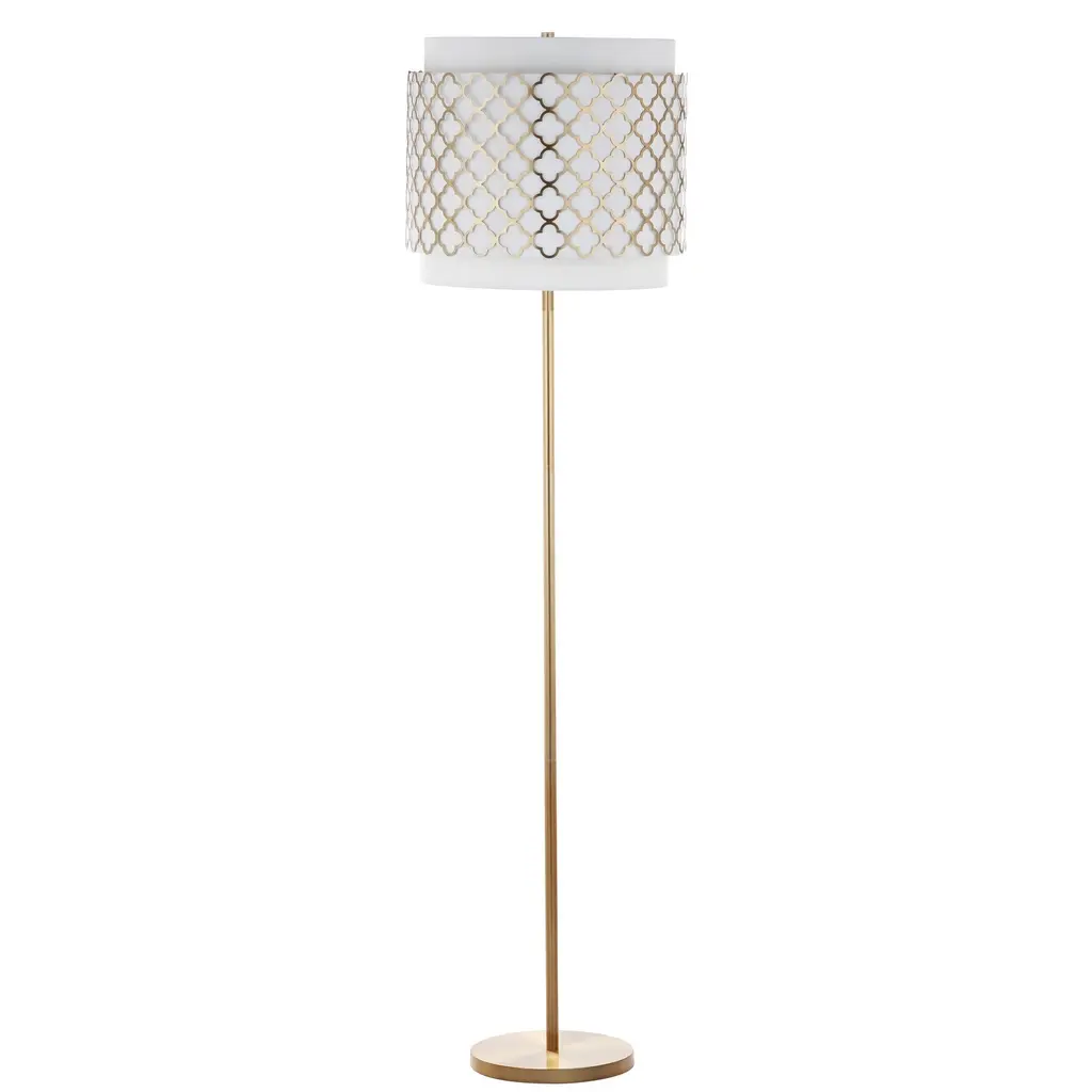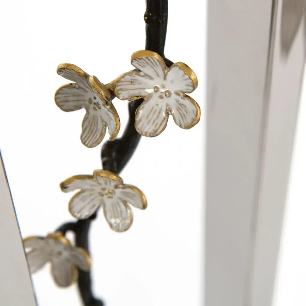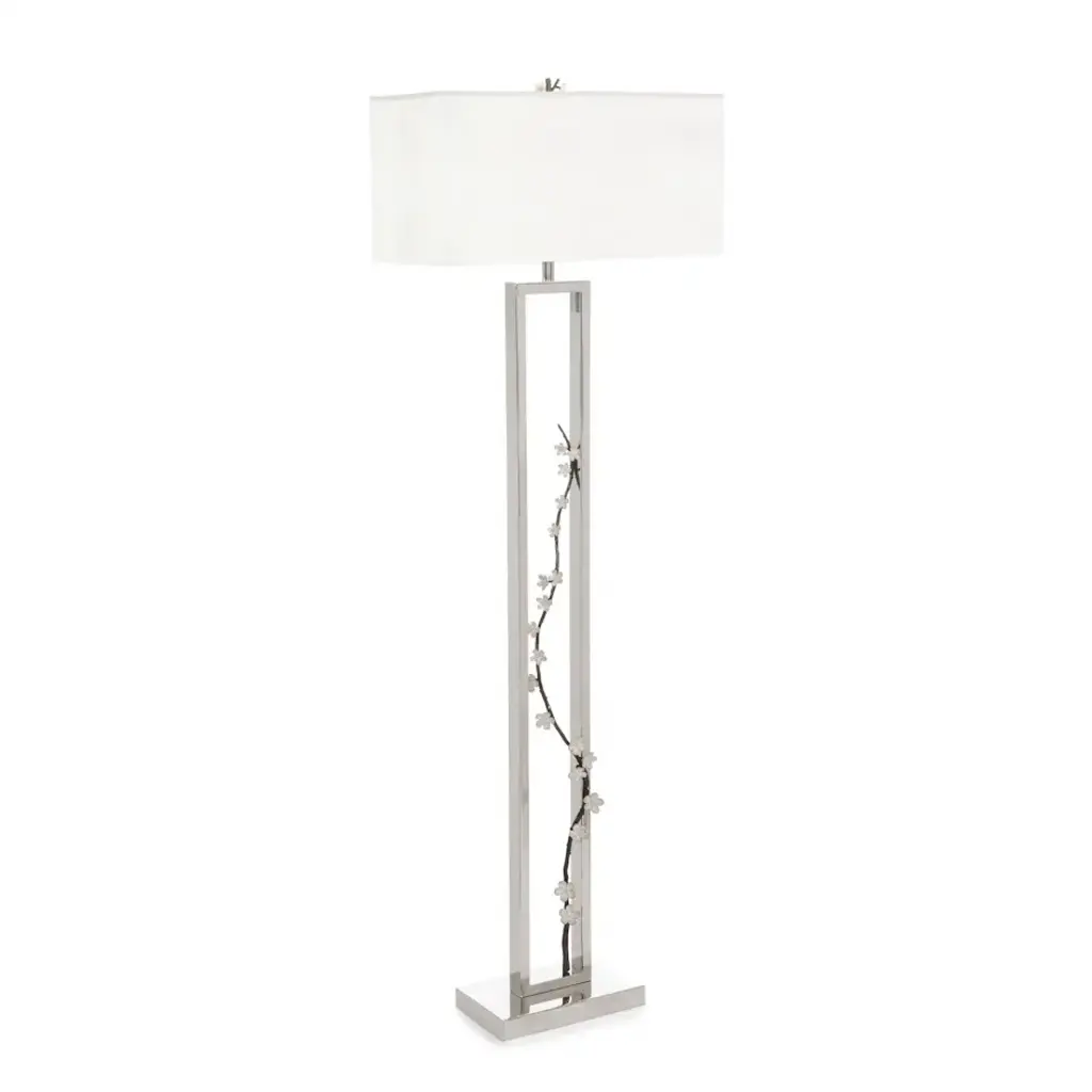 The Floral Floor Lamp features a rectangular body of Polished Stainless Steel alongside a matching base. Perfectly framed in the center of the piece, a stunning brass branch extends upwards to reveal a collection of delicate white flowers. The finial, a continuation of the white cherry blossoms, gracefully ties the piece together. This lamp is a masterful display of intelligently fusing clean, modern design with the organic curvature present in nature.