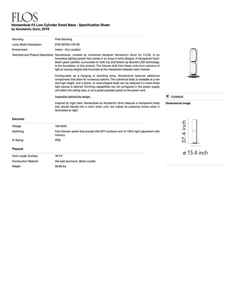 Noctambule LED dimmable floor lamp short cylinders with small base is a flamboyant-yet-functional lighting fixture crafted by the world-class designer Konstantin Grcic for FLOS. An innovative lamp that is practical and exquisite in equal measure, the product is available in an array of interesting designs. One of the highlighting aspects of this fixture is that it is very dynamic in nature. The lighting system has a transparent hand blown glass cylinder as its foundation, which is surrounded on top and at the bottom by LED technology.Users can configure this as a pendant lamp or a standing lamp by using its additional components. Putting together these units can help form columns of light at different heights that illuminate at the intersecting points between these modules. The product’s cylindrical body is available at a high and low height. Selecting its dome- or cone-shaped head can deliver a more direct light source, while the intensity and dimming can be configured in the power supply unit (within the ceiling rose) or from the panel on the power cord which is operated using a pedal.This item is compatible only in the United States. For customers located outside of this region, please inquire for availability in your area.