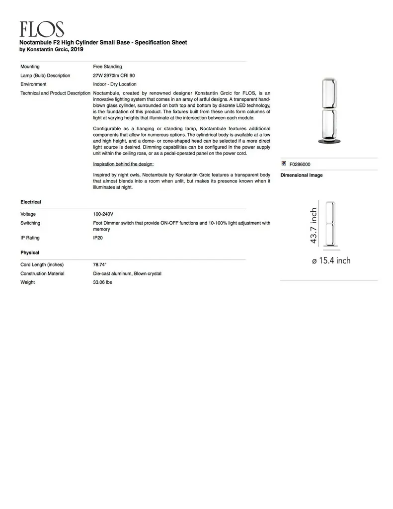 FLOS Noctambule LED dimmable floor lamp tall cylinders with small base is an ultramodern lighting fixture created by the renowned designer Konstantin Grcic. Here are some of its unmistakable features:- It can be configured as a hanging or standing lamp- It is available in a variety of designs- It features a transparent hand-blown glass cylinder as its foundation- The cylinder is surrounded by discrete LED technology at the top and bottom- Its body is available at a low and high height- A cone- or dome-shaped head can be chosen for direct lighting source- Dimming capabilities can be set up via the power supply unit or pedal panel on the power cord- Additional units and components can be attached to the product to use it as a hanging or standing lampThis item is compatible only in the United States. For customers located outside of this region, please inquire for availability in your area.