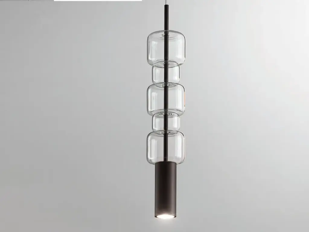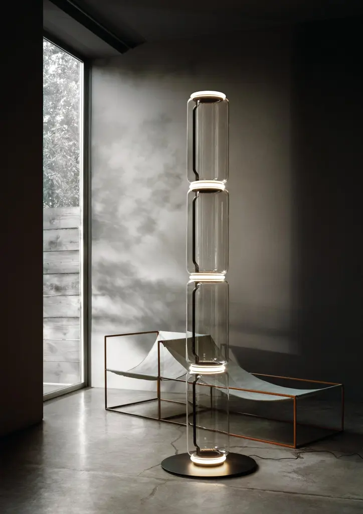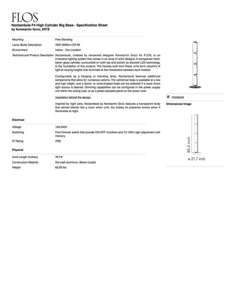 The brainchild of master designer Konstantin Grcic, Noctambule by Flos is a futuristic lighting system that blends innovation, efficiency and aesthetics. Its transparent hand blown glass cylinder is surrounded by discrete LED technology on top and at the bottom, thus making the foundation of the lamp stylish and stunning. The user can attach additional components to the fixture in order to experiment with different styles of lighting. This helps create columns of light at varying heights that light up at the intersecting points between each module or unit.Noctambule LED dimmable floor lamp cylinders, cone, bowl top, large base can be configured as a hanging lamp or a standing light, depending on the need and preferences. Its dimming capabilities can be set through the power supply unit within the ceiling rose, or via a pedal-operated panel provided on the power cord. The modern lamp’s cylindrical body is available at both a low and high height, while users can choose between the dome-shaped head or cone-shaped head for a more direct light source.Inspiration behind the design:Inspired by night owls, Noctambule by Konstantin Grcic features a transparent body that almost blends into a room when unlit, but makes its presence known when it illuminates at night.This item is compatible only in the United States. For customers located outside of this region, please inquire for availability in your area.