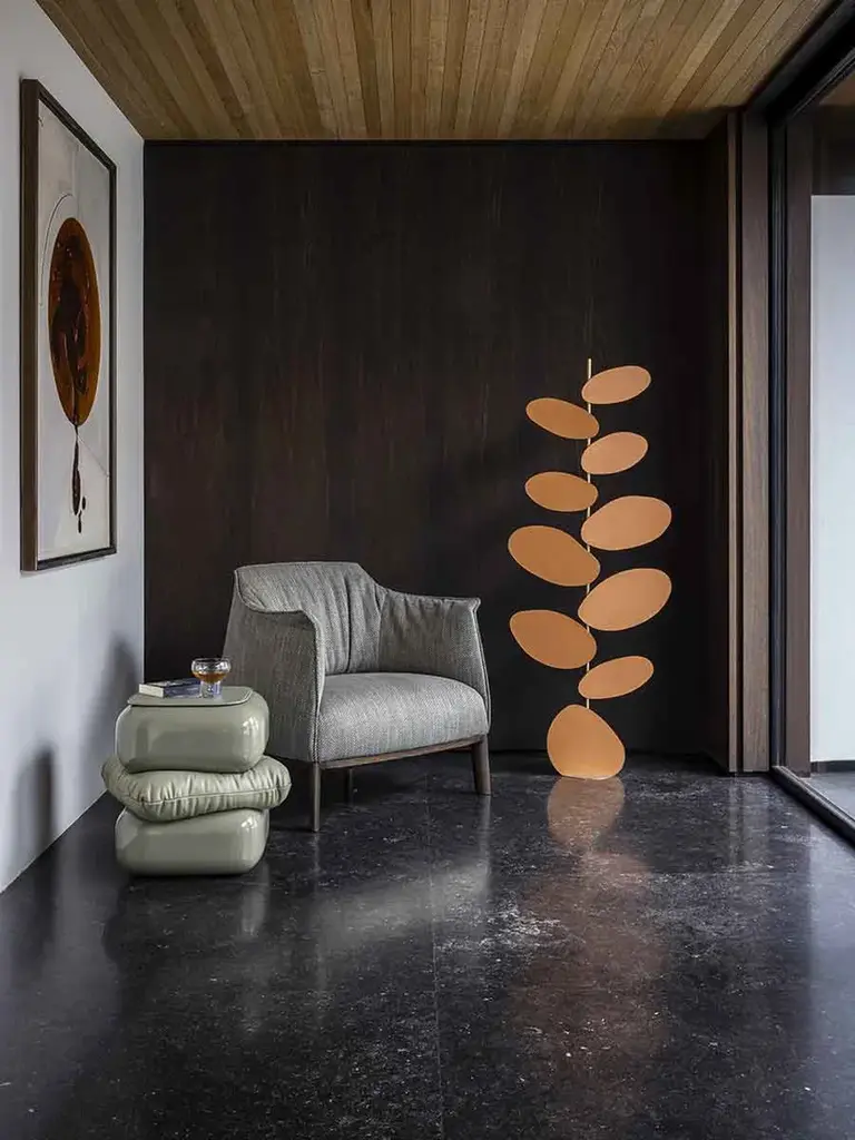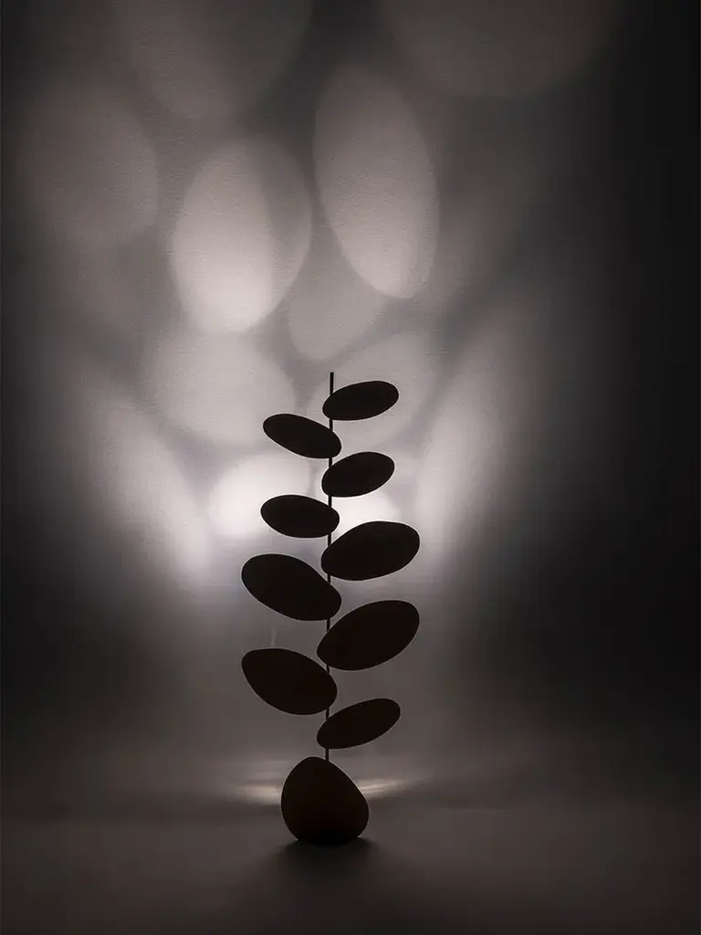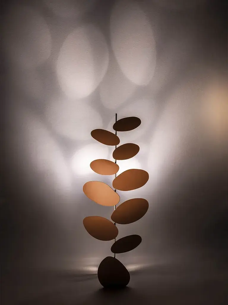 Designed by Six N. Five, the Foliage floor lamp consists of a brass base on which there develops a stylized "tree", still made of brass, with the leaves covered with Pelle Frau® Leather. An innovative system created specifically by Poltrona Frau enables to emit light from below and create the illusion of a "silhouette" effect of the leaves, which reverberates on the surrounding walls.