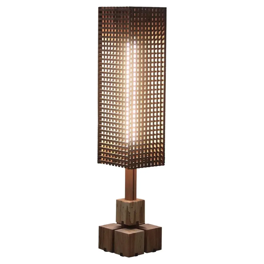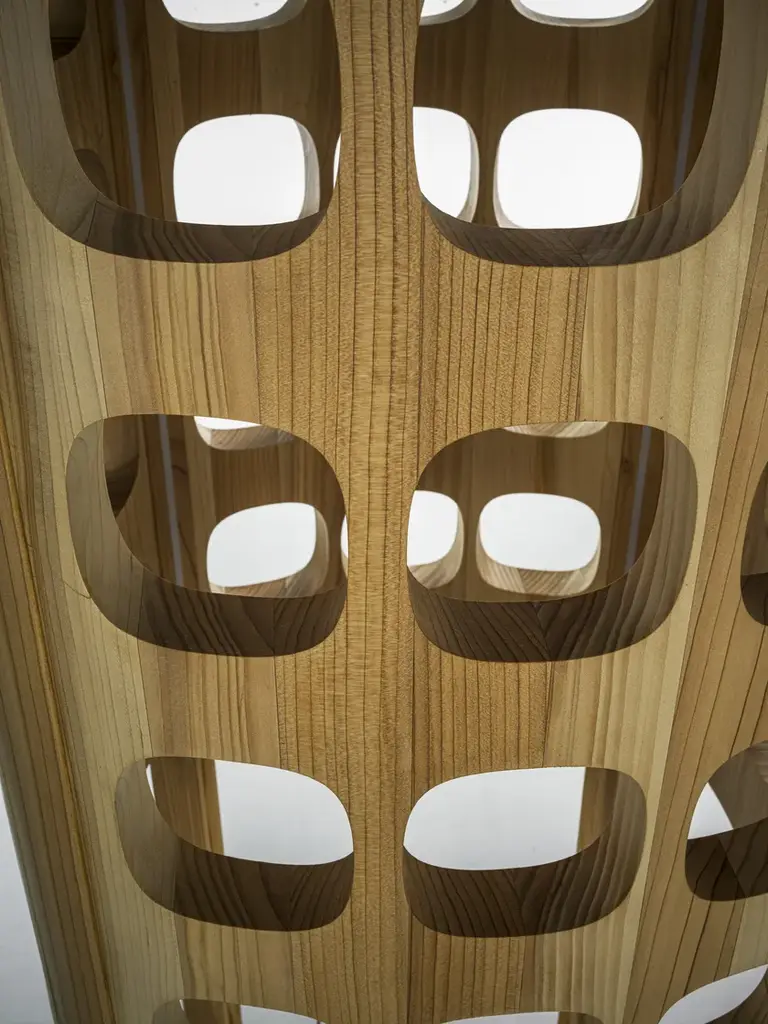 Forella is a floor lamp with a sculptural design, made entirely of solid wood. The alternation of full and empty spaces allows light, thanks to LED strips, to filter through the wood.