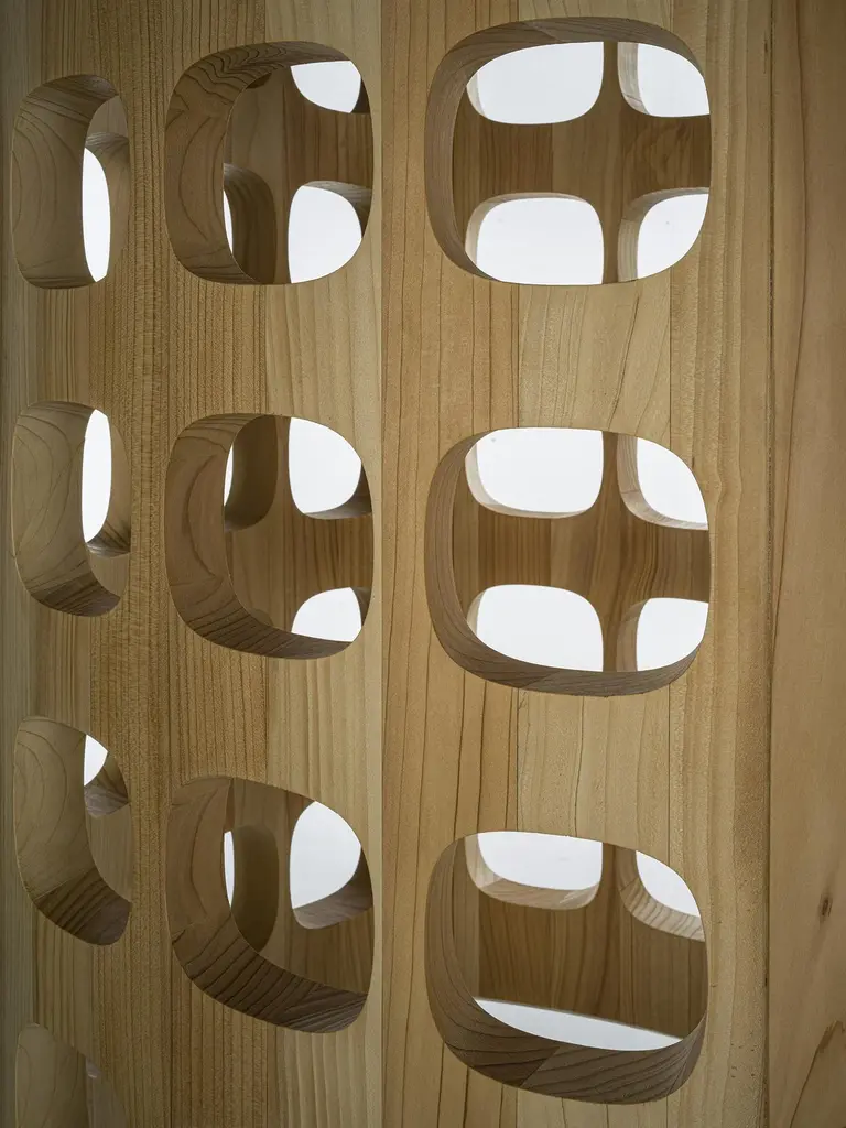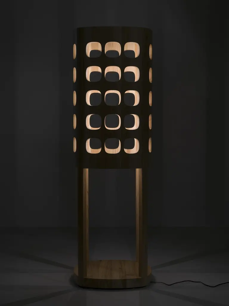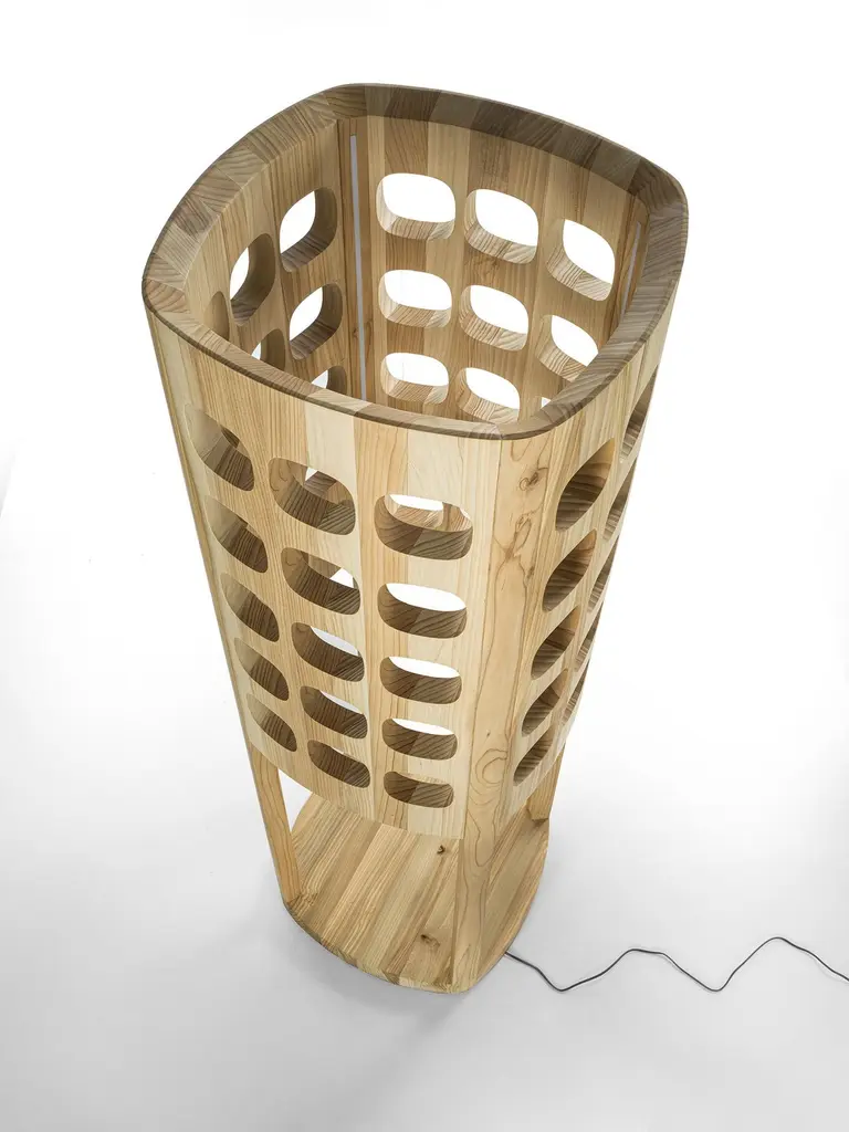 Floor lamp with a sculptural design, made entirely of solid wood. The alternation of full and empty spaces allows light, thanks to LED strips, to filter through the wood.