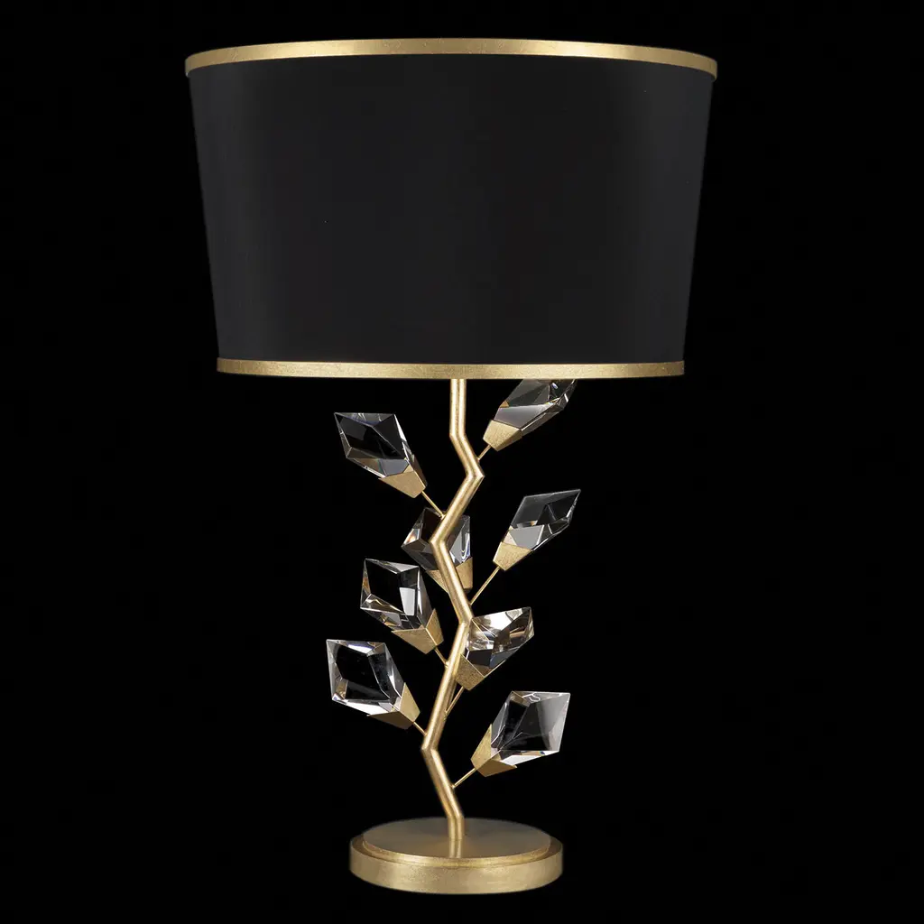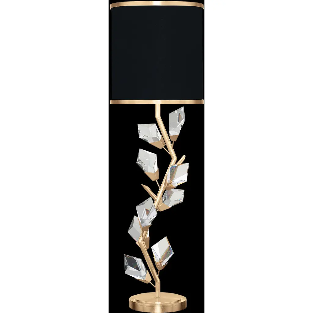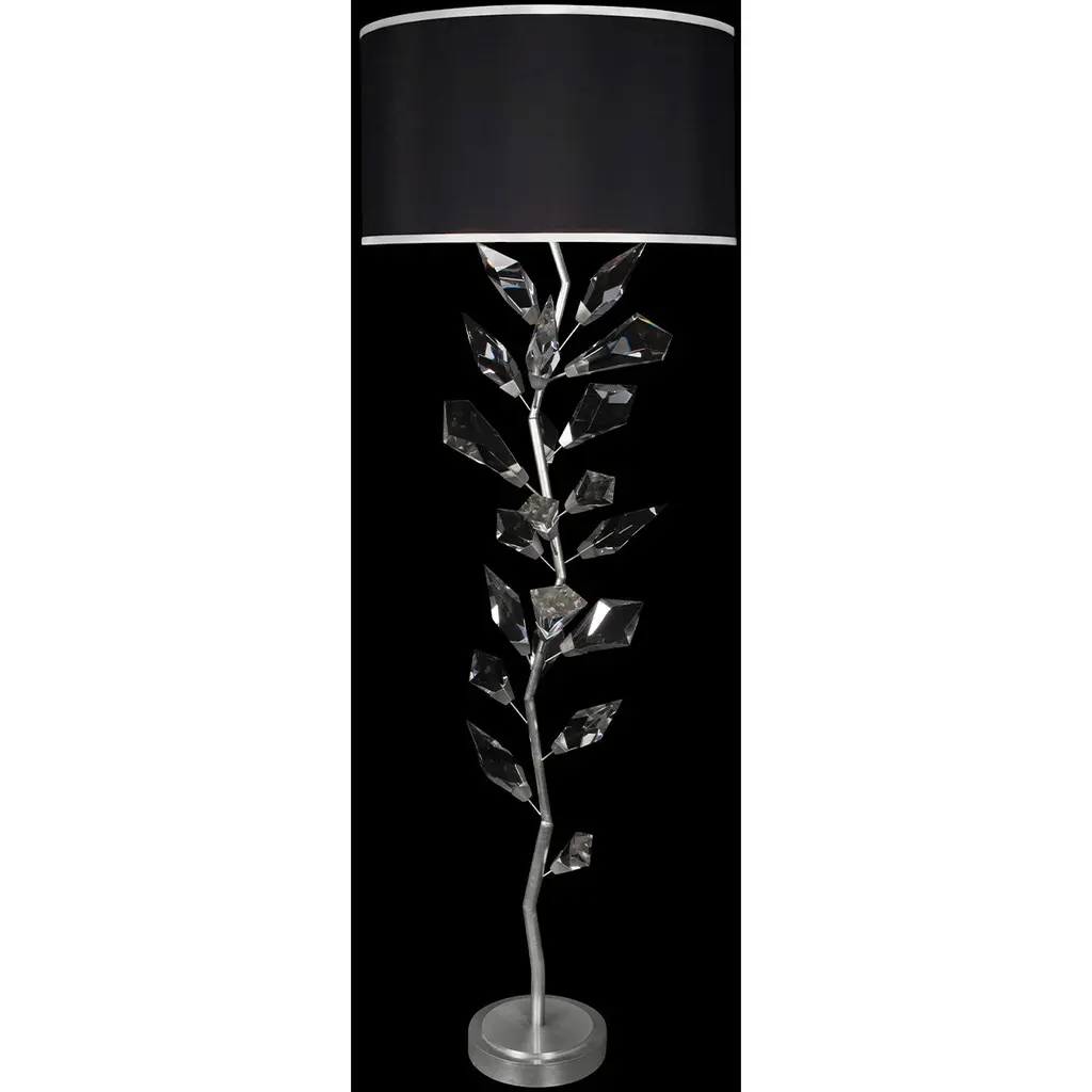 Inspired by nature and its majestic forests, this gold leaf Foret floor lamp features modern branches adorned with bold, hand-cut faceted crystal leaves and a black fabric shade with gold interior and gold leaf metal trim. Also available in silver leaf with black fabric shade, silver interior and silver leaf metal trim.