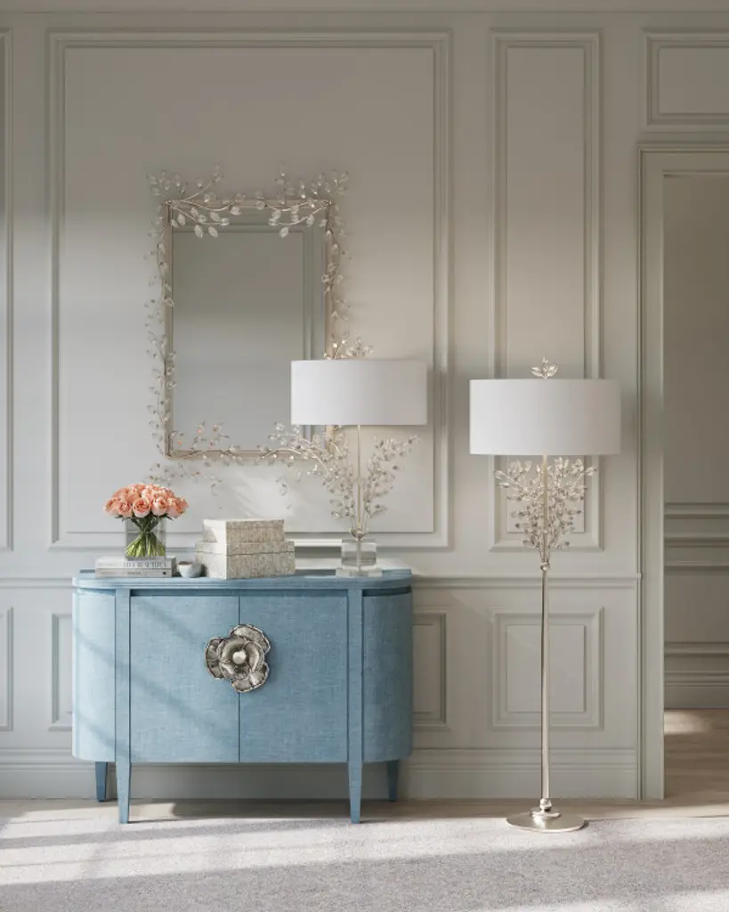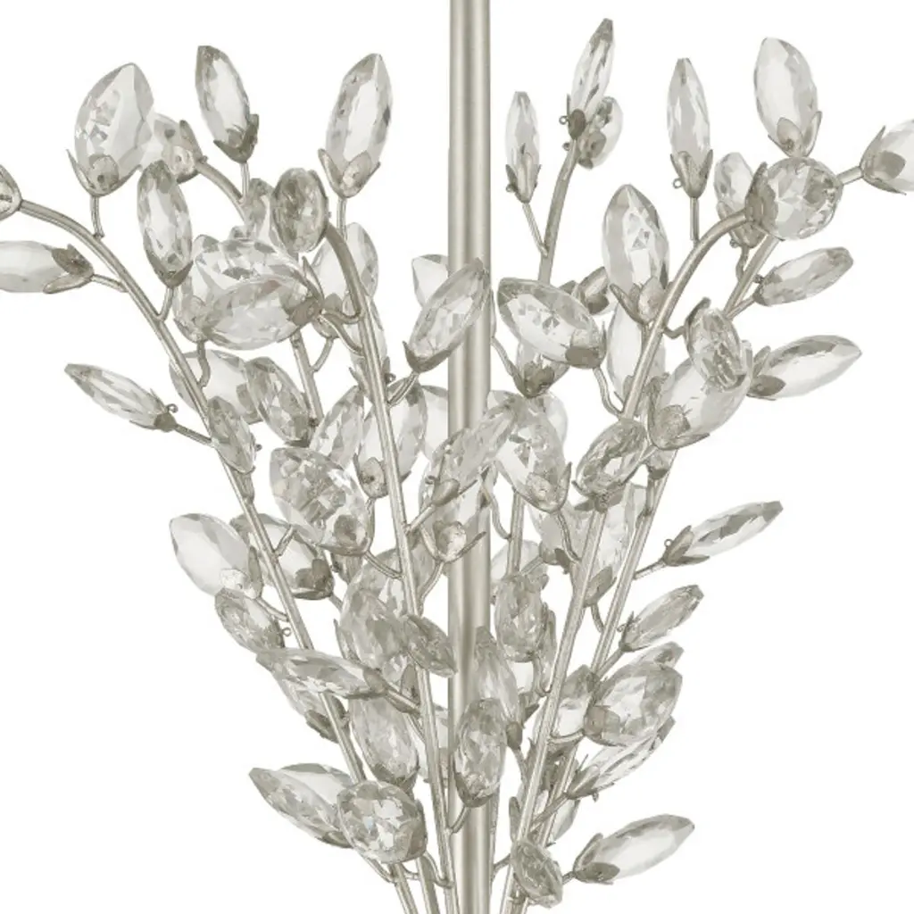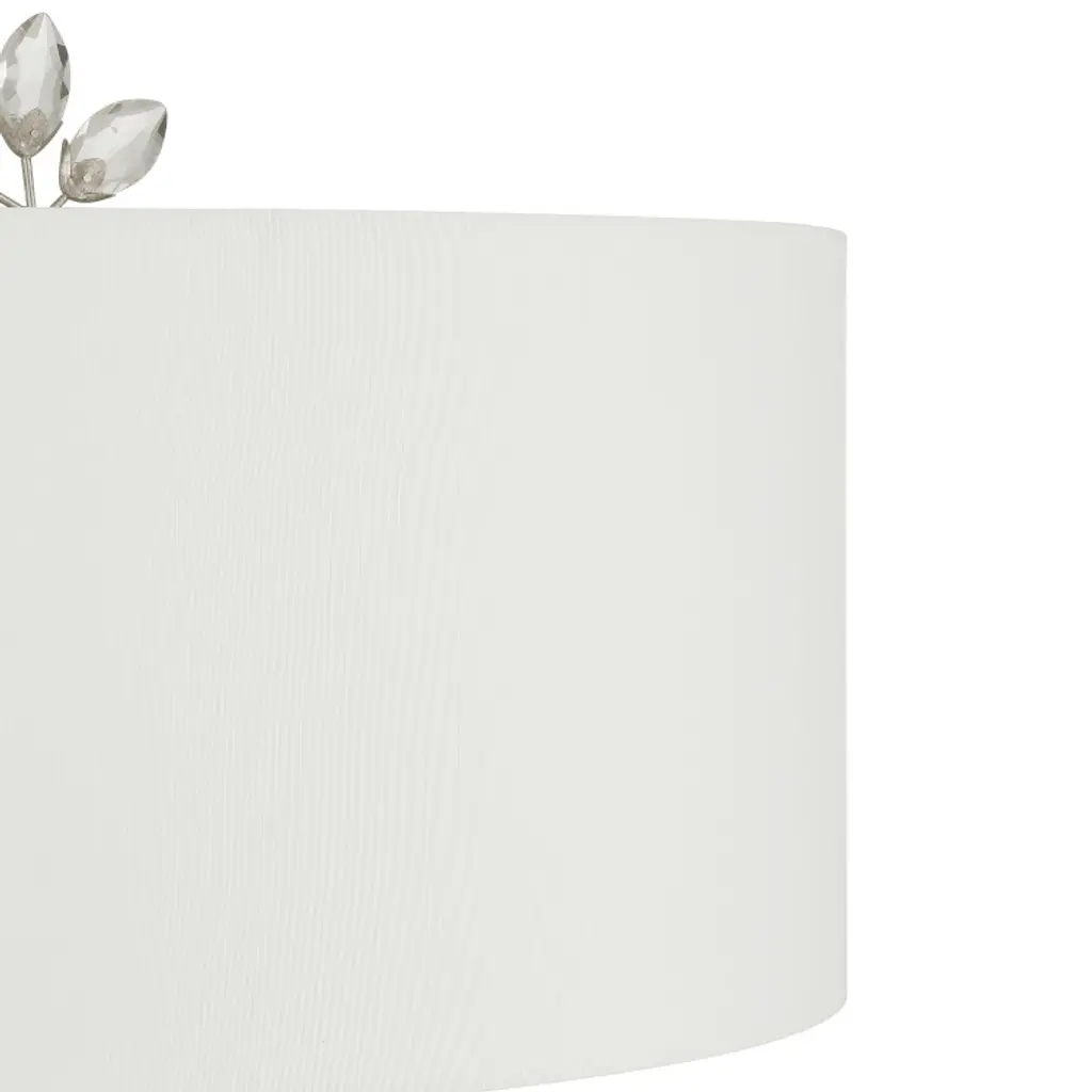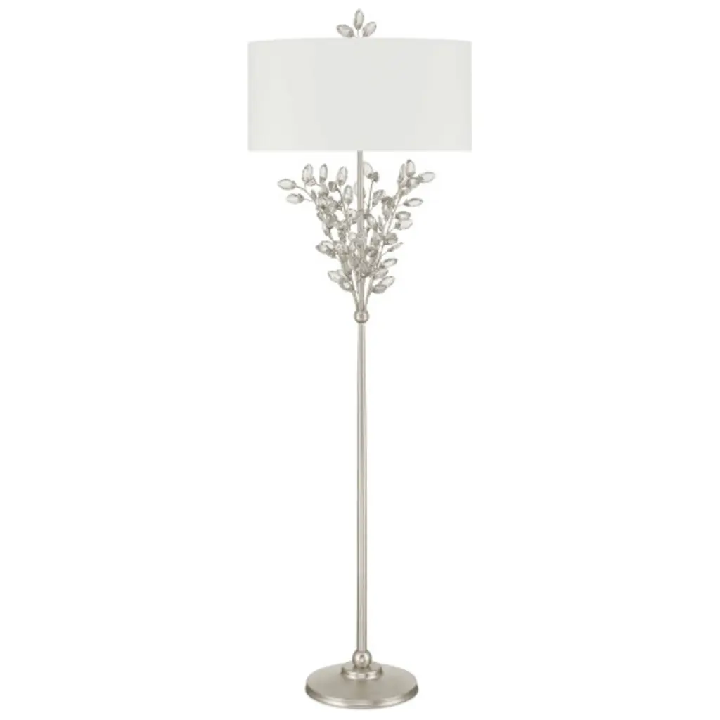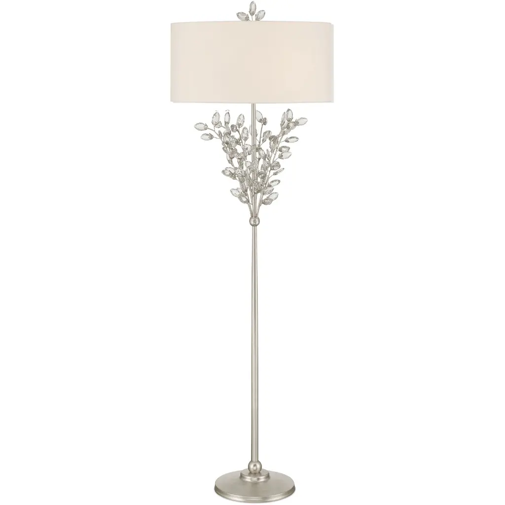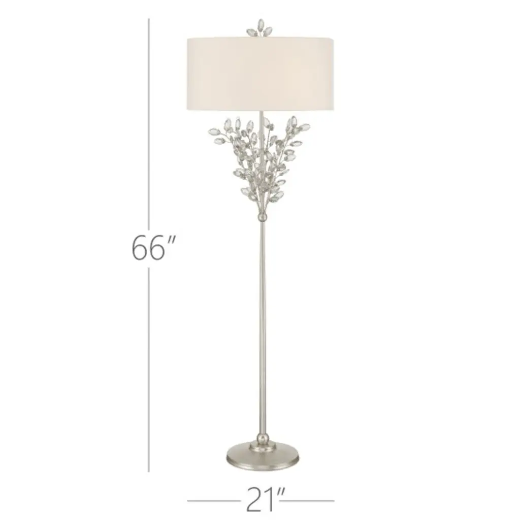 The Forget-Me-Not Floor Lamp is a stunning blend of luxury and artistry. A radiant leaf finish adds a touch of opulence while shimmering flowers crafted from crystals flow up from the thin stem toward the shade for an elegant, nature-inspired design. The two-light floor lamp has a drum shade that is fastened with a gleaming crystal finial.