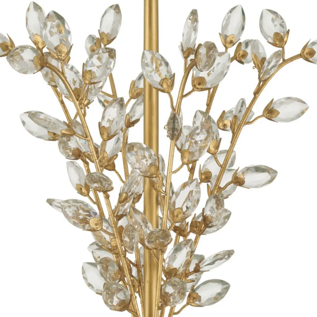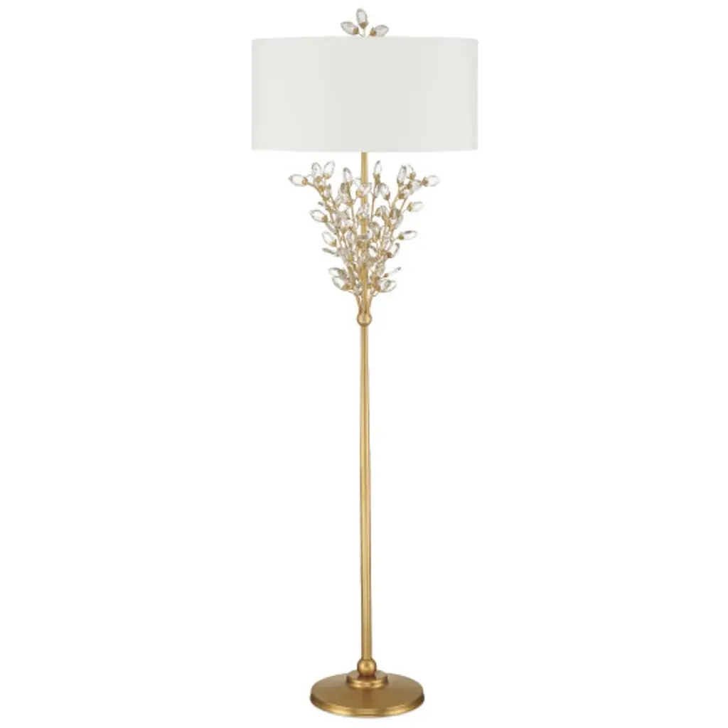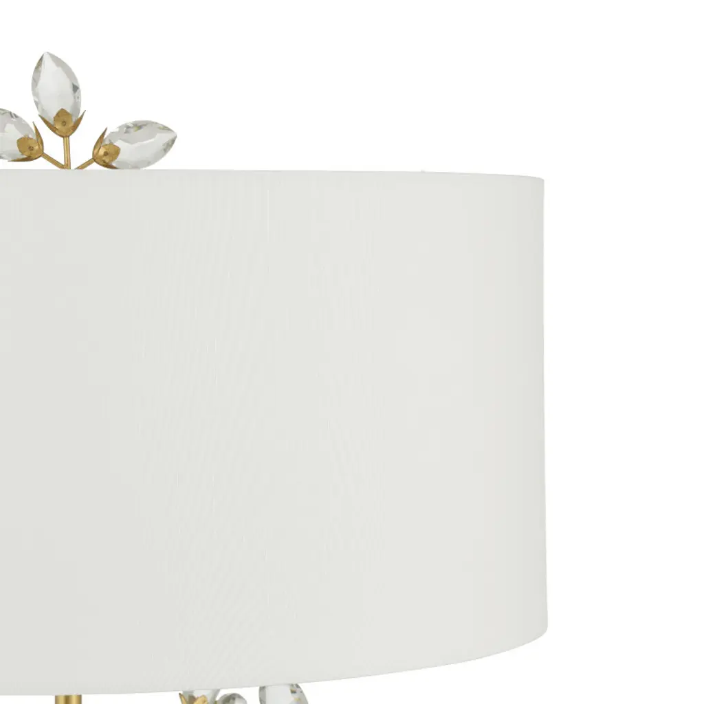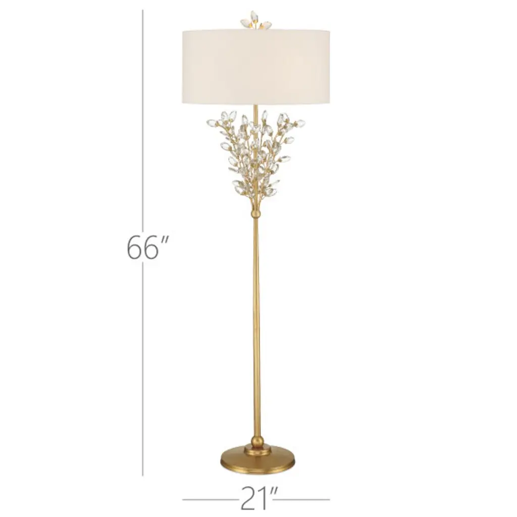 The Forget-Me-Not Floor Lamp is a stunning blend of luxury and artistry. A radiant leaf finish adds a touch of opulence while shimmering flowers crafted from crystals flow up from the thin stem toward the shade for an elegant, nature-inspired design. The two-light floor lamp has a drum shade that is fastened with a gleaming crystal finial.