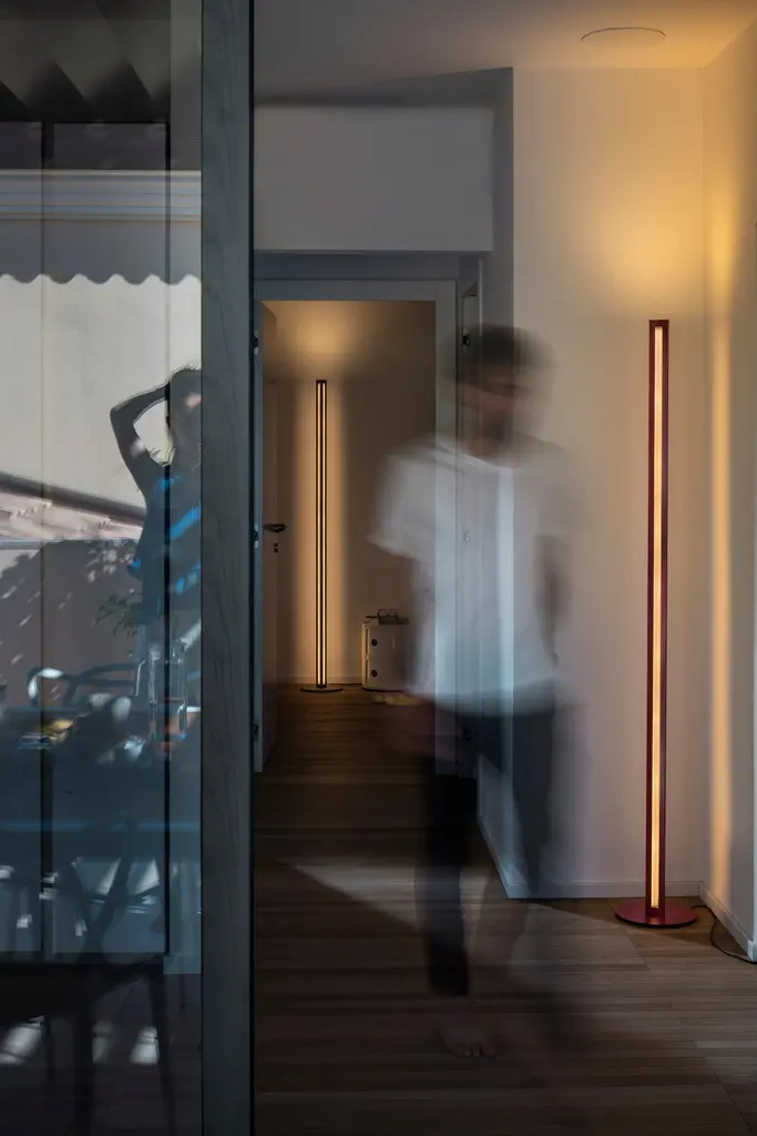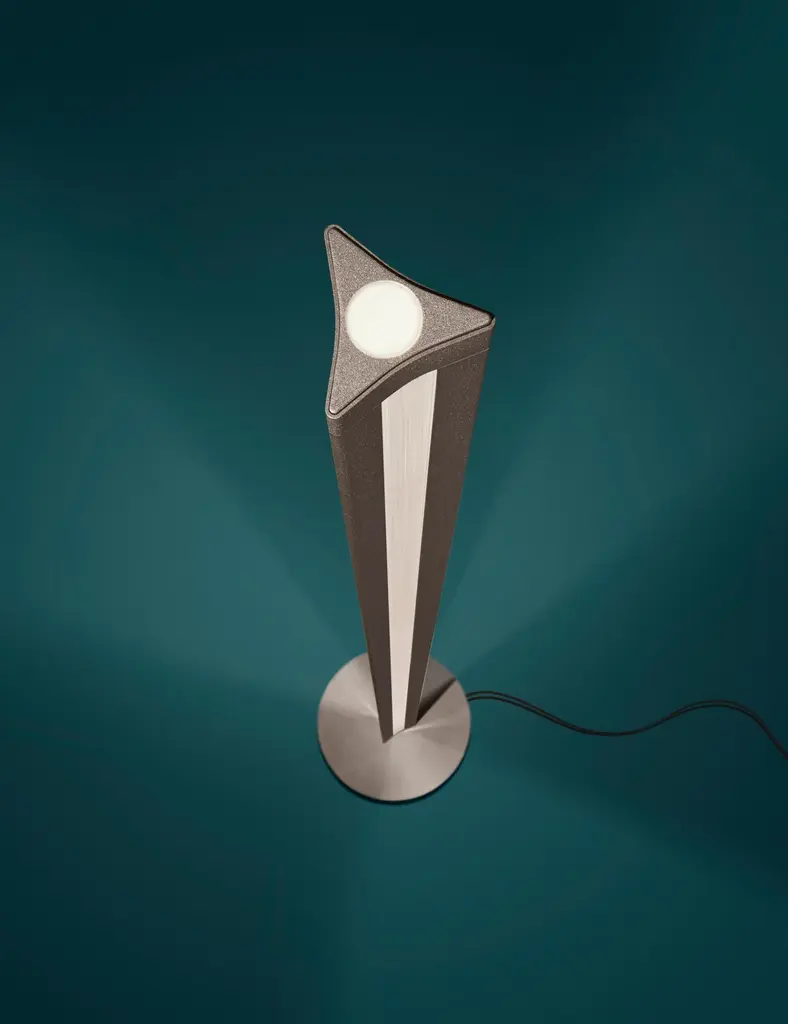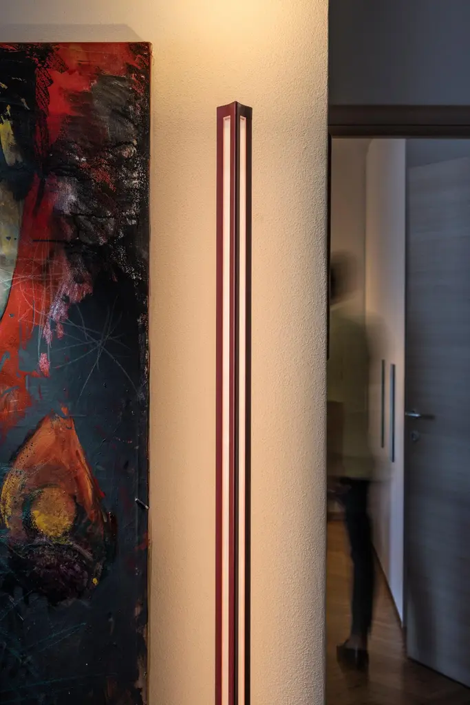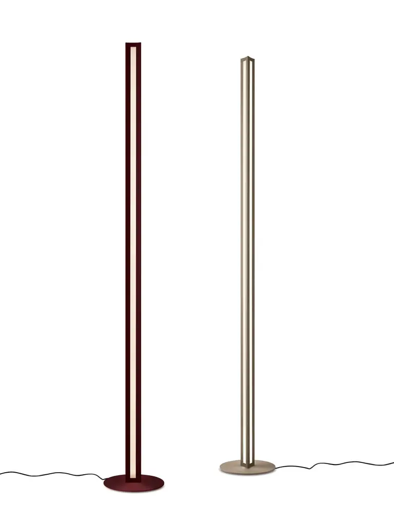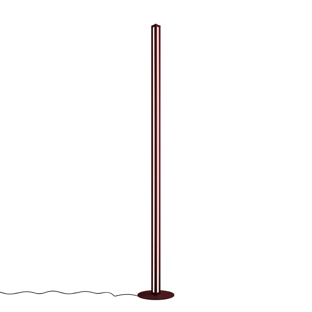A minimalist sculptural body for all-round lighting. Chiaroscura reinterprets the classic luminator, expanding its functionality thanks to a triangular structure that diffuses ambient light to the sides and direct light to the ceiling.Materials:Liquid-coated aluminium, PMMA and metal.Light Source:LED included37W2700 K 4730 lm CRI>80Dimmer includedColor:Dark Red, Titanium