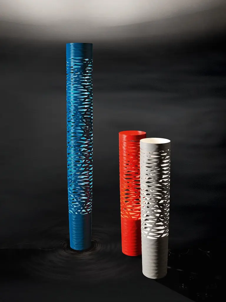 Floor lamp with diffused and indirect light. The fiberglass-based composite material diffuser is produced by modeling tape along a mold with an automatic control of the pitch/pattern, which is then epoxy powder coated. The large version features two separate light sources: one is located at the upper tip of the diffuser, and the other inside the diffuser; upper parabola made of aluminium. The transparent cable is fitted with a dimmer which can be used both to adjust the level of luminous intensity of the upper light source gradually or as the On/ Off switch for the lower light source. In the medium version: single light source in the base inside the diffuser; the dimmer fitted on the transparent cable can be used both to adjust the level of luminous intensity gradually as well as an On/Off switch.Materials:Coated fiberglass-based composite material, varnished metal and aluminum.Light source:LED 2 x 51.7 W.Color:Black.