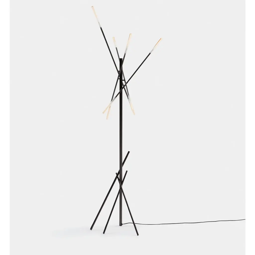 Floor lamp with direct adjustable light made of extruded aluminum coated with liquid paint. Main frame defined by three tubular elements, with an interior ballast at the base and fitted with a non-slip thermoplastic protective foot. On the three main branches, LED boards with independent switches screened with an opaline polycarbonate diffuser. The touch dimmer switch is situated at the lower end of the screen, to turn the lamp on and o+ and adjust the light intensity. A Te-on seal ensures an easy and durable 350° movement of the three light sources. Black electrical cable. Electronic transformer fitted on the plug. The lamp can be controlled from a wall outlet.Materials:Varnished aluminum and polycarbonate.Light Source:LED 3x 54W.Color:Black.