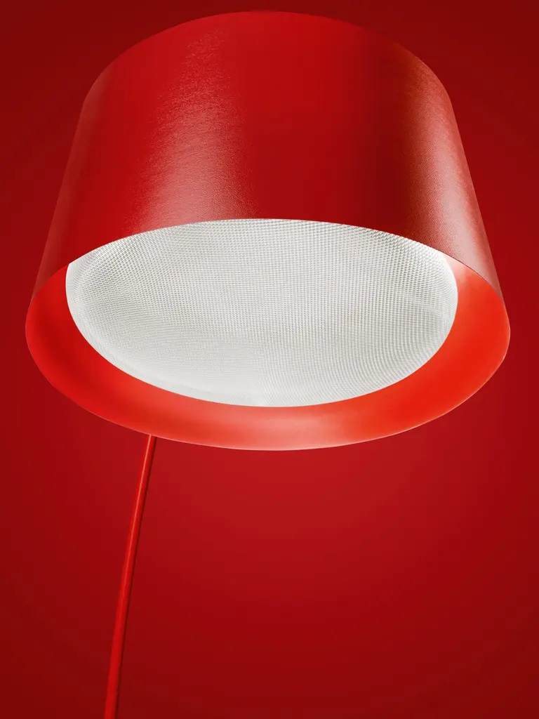 Large floor lamp with direct and indirect up light. Diffuser and rod made of fiberglass-based composite material and liquid coated. The lamp body consists of a large painted aluminum cone. The Diffuser which tops o¬ the cone, where one of the two LED boards is installed, is in PMMA with a prismatic pattern and curved on the edges. The upper LED board is protected by a branded PMMA disc. The large round colored base is made of epoxy powder coated metal; while the LED transformer is housed inside the metal and steel ballast beneath the colored base. The transparent electrical cable is "fitted with a dimmer which can be used both to adjust the level of luminous intensity gradually or as the ON/OFF switch.Materials: Coated fiberglass-based composite material, PMMA, polycarbonate, coated metal and aluminum (LED)Light source: LED 2x 81W.Color: Greige.