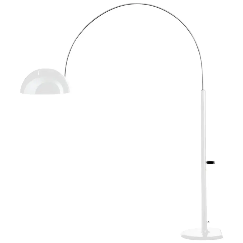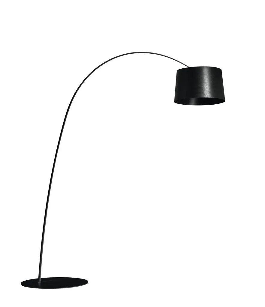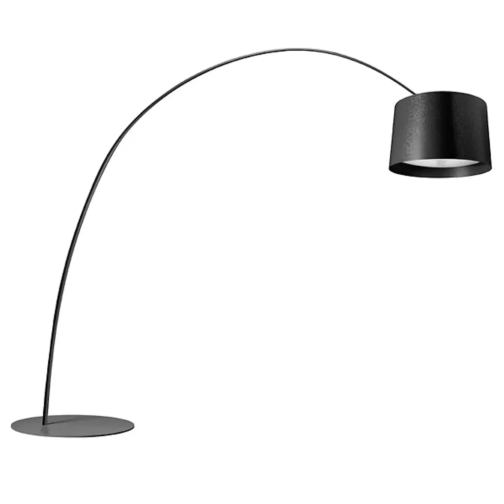 Floor lamp with direct and indirect light. Diffuser and rod made of fiberglass–based composite material and liquid coated. Translucent polycarbonate upper diffuser disc, PMMA lower diffuser disc with polyprismatic internal surface. Epoxy powder coated metal round base. Supplied with 4 counter–weights to be inserted in the purpose–provided seat above the diffuser to adjust its height. For LED version the circuit boards were purpose–designed by Foscarini, to achieve a superior level of color rendering (CRI) and retaining the same color temperature as a halogen light source (Kelvin). The two LED circuit boards are installed on an aluminium disc that acts as a dissipater, and the upper board is protected by a small PMMA disc. Additional arc–extending rods available upon request; the black cable is fitted with a dimmer which can be used both to adjust the level of luminous intensity gradually or as the On/Off switch.Materials: Coated fiberglass-based composite material, PMMA, polycarbonate, coated metal and aluminum (LED).Light source: LED 2 x 33W.Color: Black.