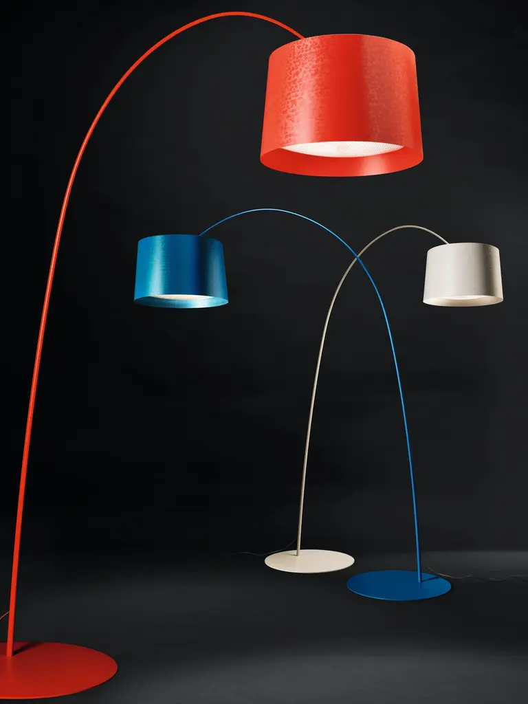 Floor lamp with direct and indirect light. Diffuser and rod made of fiberglass–based composite material and liquid coated. Translucent polycarbonate upper diffuser disc, PMMA lower diffuser disc with polyprismatic internal surface. Epoxy powder coated metal round base. Supplied with 4 counter–weights to be inserted in the purpose–provided seat above the diffuser to adjust its height. For LED version the circuit boards were purpose–designed by Foscarini, to achieve a superior level of color rendering (CRI) and retaining the same color temperature as a halogen light source (Kelvin). The two LED circuit boards are installed on an aluminum disc that acts as a dissipater, and the upper board is protected by a small PMMA disc. Additional arc–extending rods available upon request; the black cable is fitted with a dimmer which can be used both to adjust the level of luminous intensity gradually or as the ON/OFF switch.Materials: Coated fiberglass-based composite material, PMMA, polycarbonate, coated metal and aluminum (LED).Light source: LED 2x 33W.Color: Crimson.