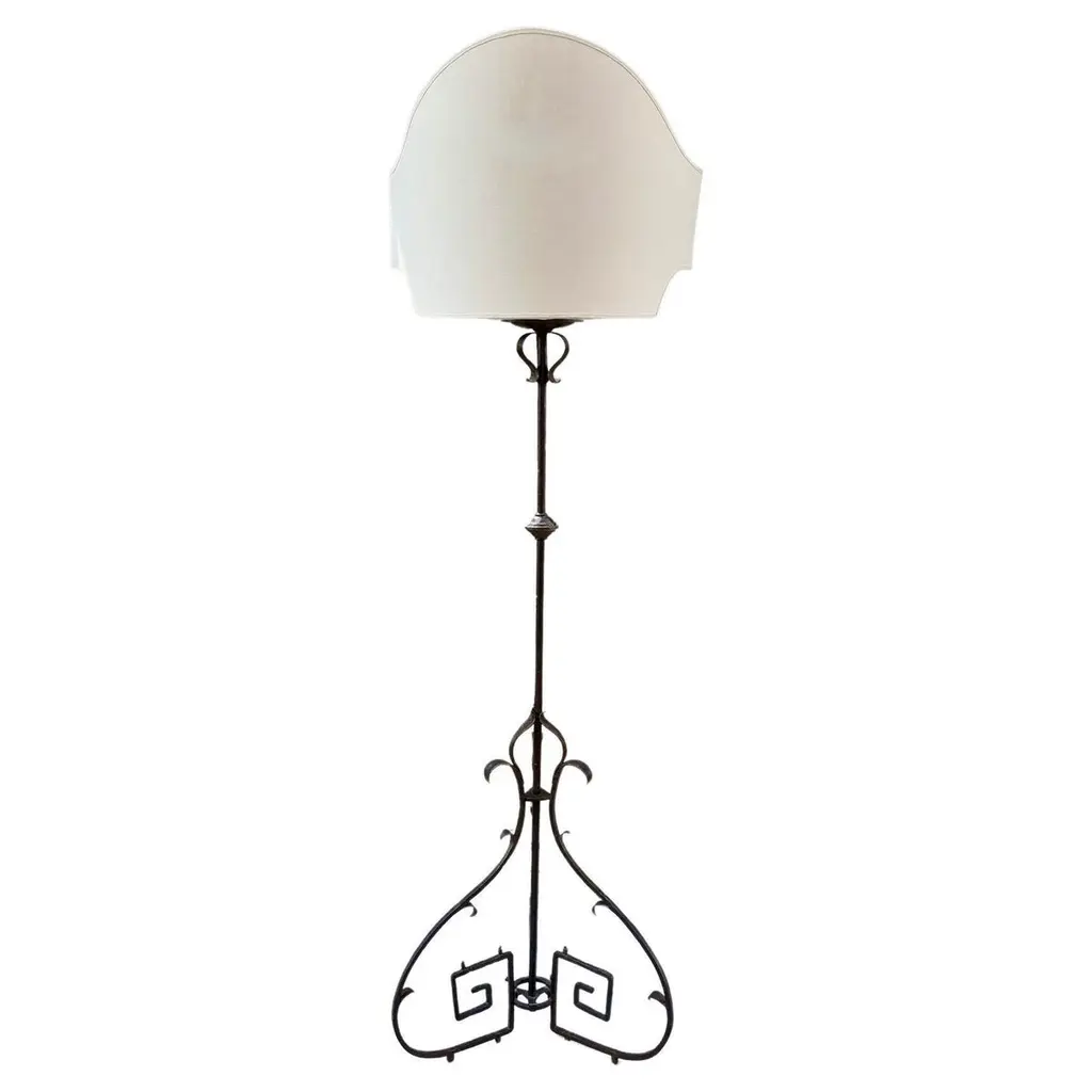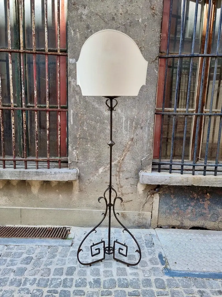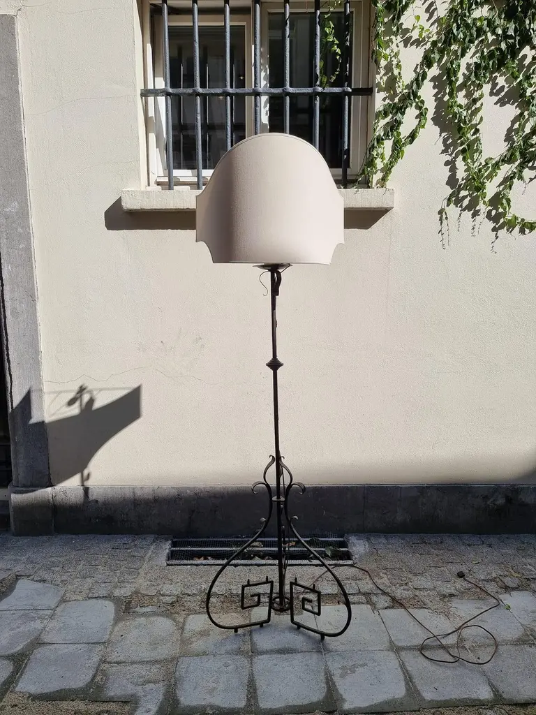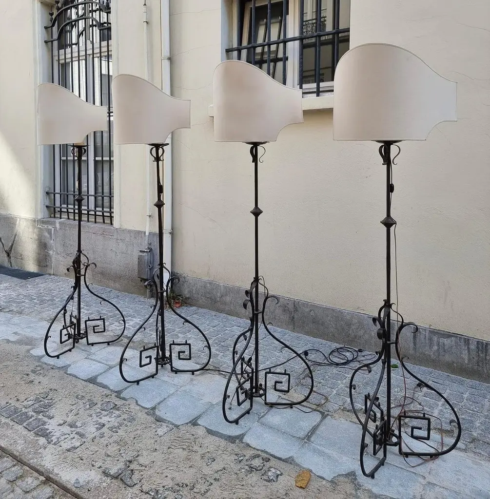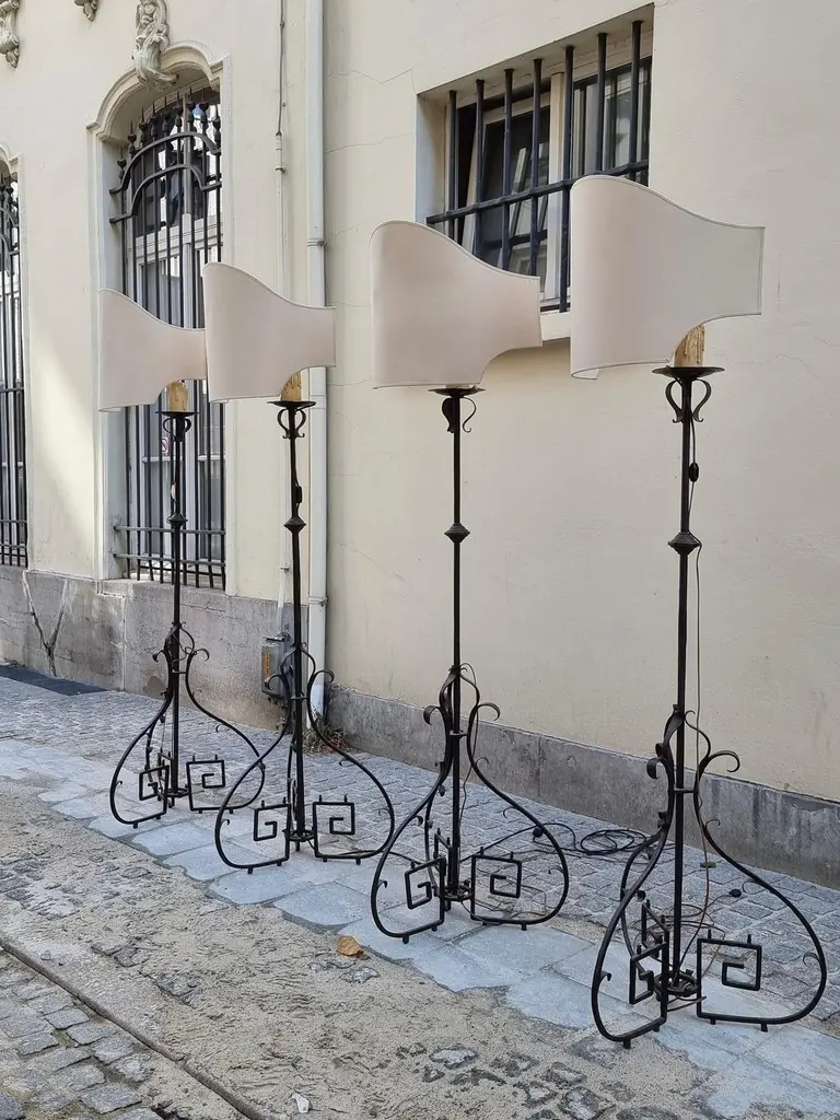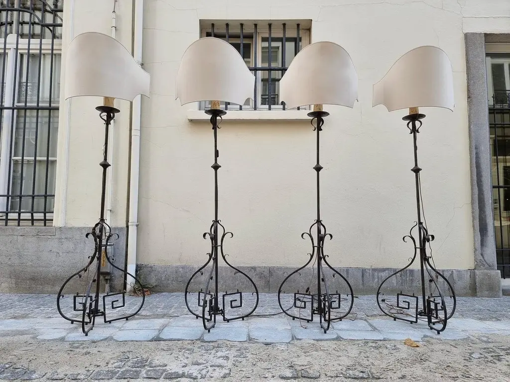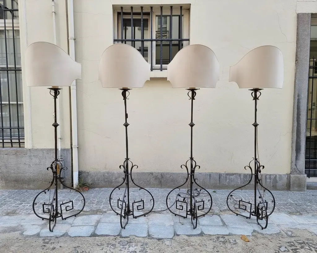 Four hand forged Art Deco floor-lamps or candlesticks. If you appreciate the Art Deco style as much as we do then you could be the next custodian of this amazing and all handcrafted floor lamps. A highly skilled artisan around the turn of the century has spent many hours sweating (over several days) whilst hand-hammering this wrought iron candlestick or floor lamp. The result is beautiful and it will only get more beautiful, because of the patina, which will only get more rich. Thanks to the solid base this Art Deco work of art also stands very strong and stable. We have a passion for the unique, for quality, for stylish yet practical and for craftsmanship of years gone by. Your purchases will be extremely well packaged and we look forward to serving you (again). You can shop all our 1000+ listings by pushing the button that reads 'View All From Seller'.Dimensions base ,Height 75" - 190 cm.Diameter 24" - 60 cm.Height with shade 80" - 204 cm.Shade 24" - 12".Weight 10 kg.