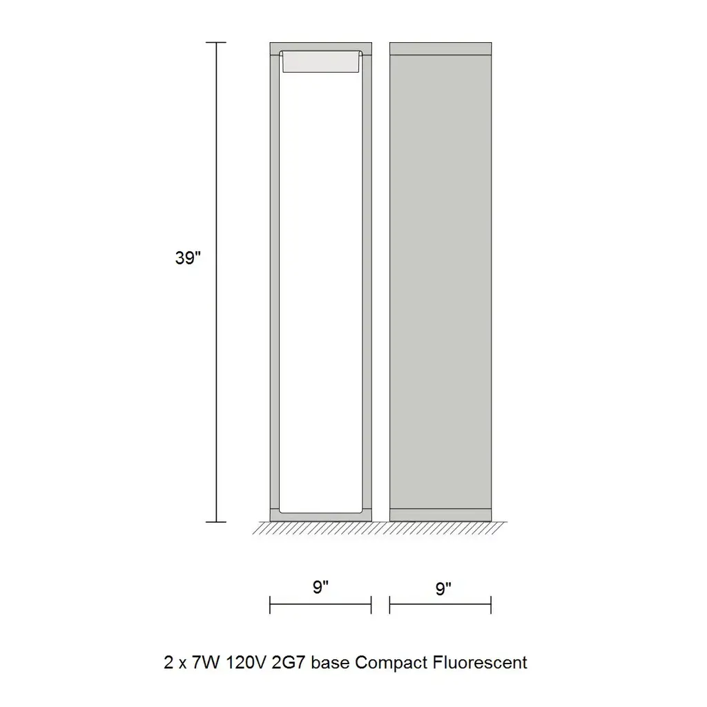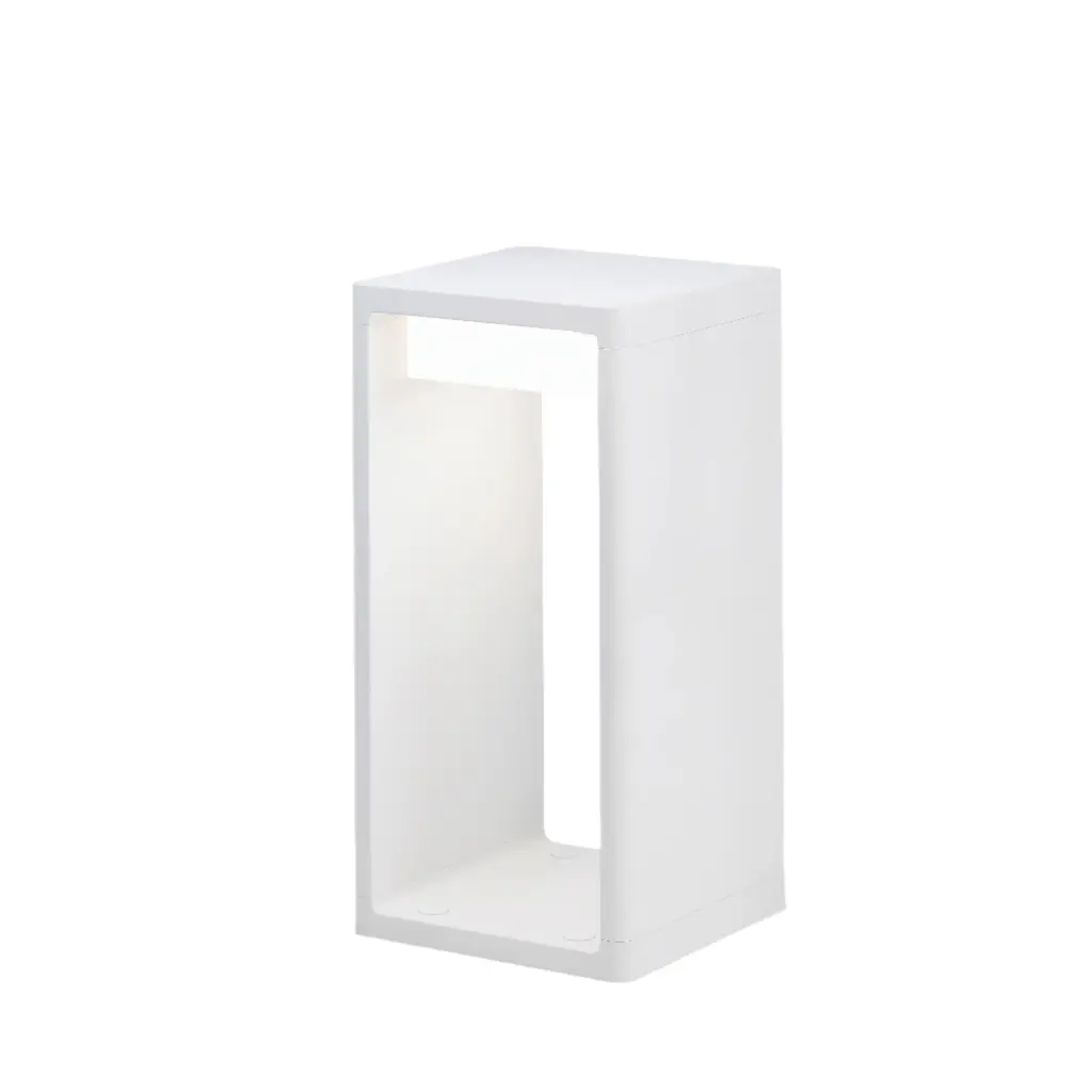 An outdoor low-level luminaire shaped like a hollow rectangular prism with rounded edges. Frame’s body is made from aluminum, the diffuser from pressed glass. The diffuser fully illuminates Frame’s interior while softly illuminating the surrounding area. Features