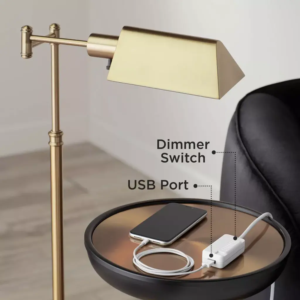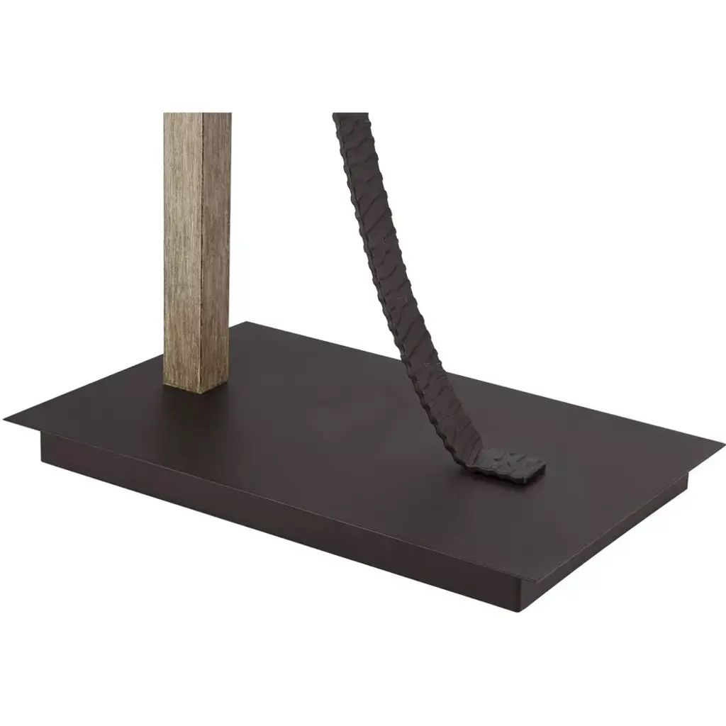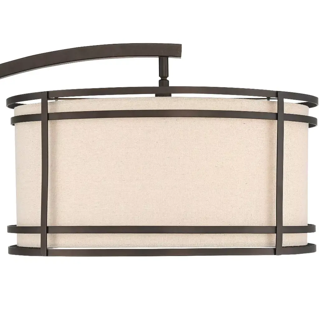 From the Franklin Iron Works brand, this two-light floor lamp with a USB dimmer is a great addition to a bedroom or living room space. It comes in a metal downbridge frame, covered in an oil-rubbed bronze finish with faux wood finish accents. An oatmeal drum shade hangs from the top, supported by a minimalist metal cage design. The tabletop dimmer works with dimmable CFL and dimmable LED bulbs, as well as halogen and incandescent bulbs, and it also comes with a built-in USB port, allowing you to easily charge phones and other devices.