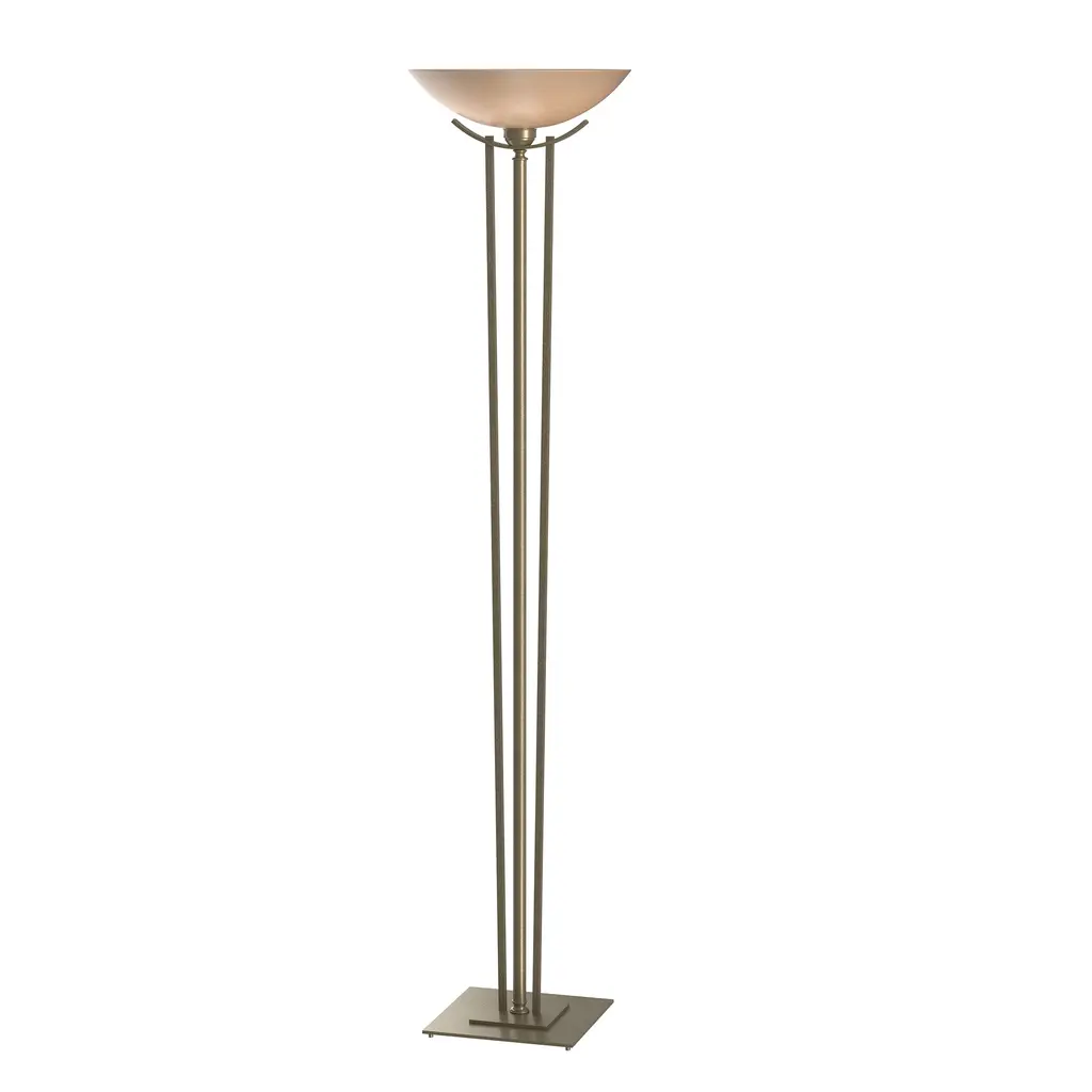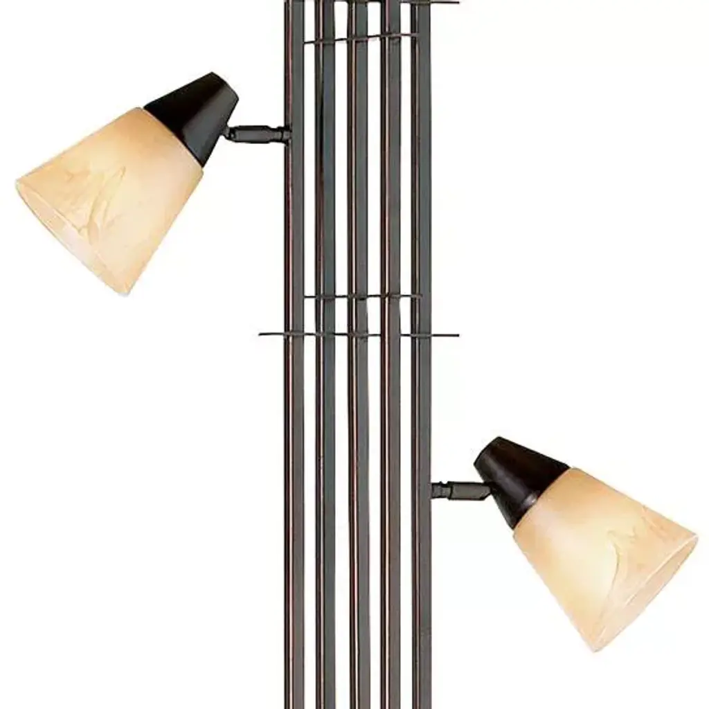 Task lamps help breathe new light into a room. This torchiere floor lamp stands tall with tiered bands of metal and champagne glass. Top torchiere light provides overall room illumination, while the twin side lights adjust for reading. Floor switch controls dimmer for top light and on-off button for side lights.