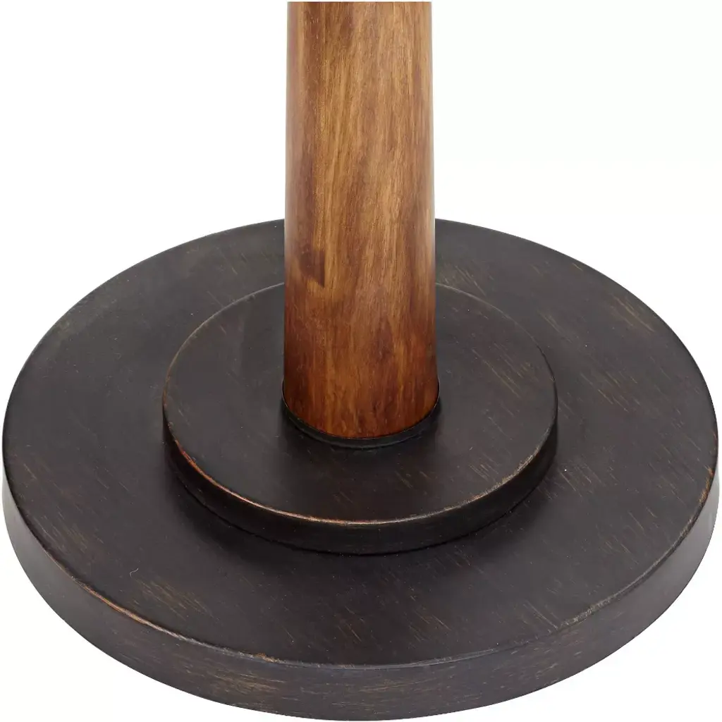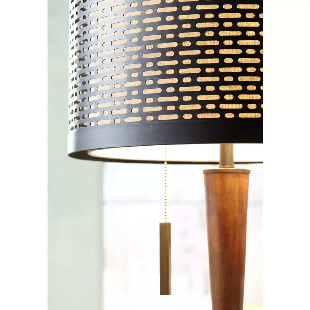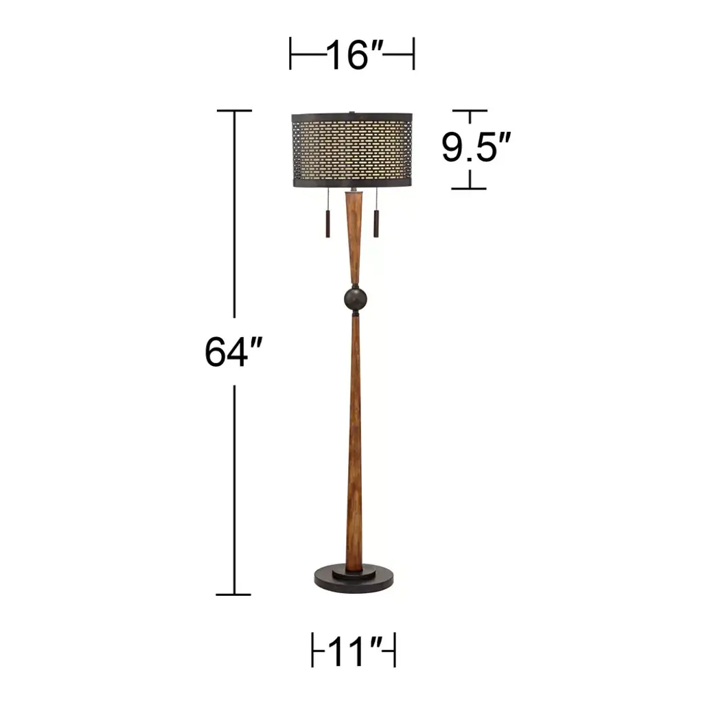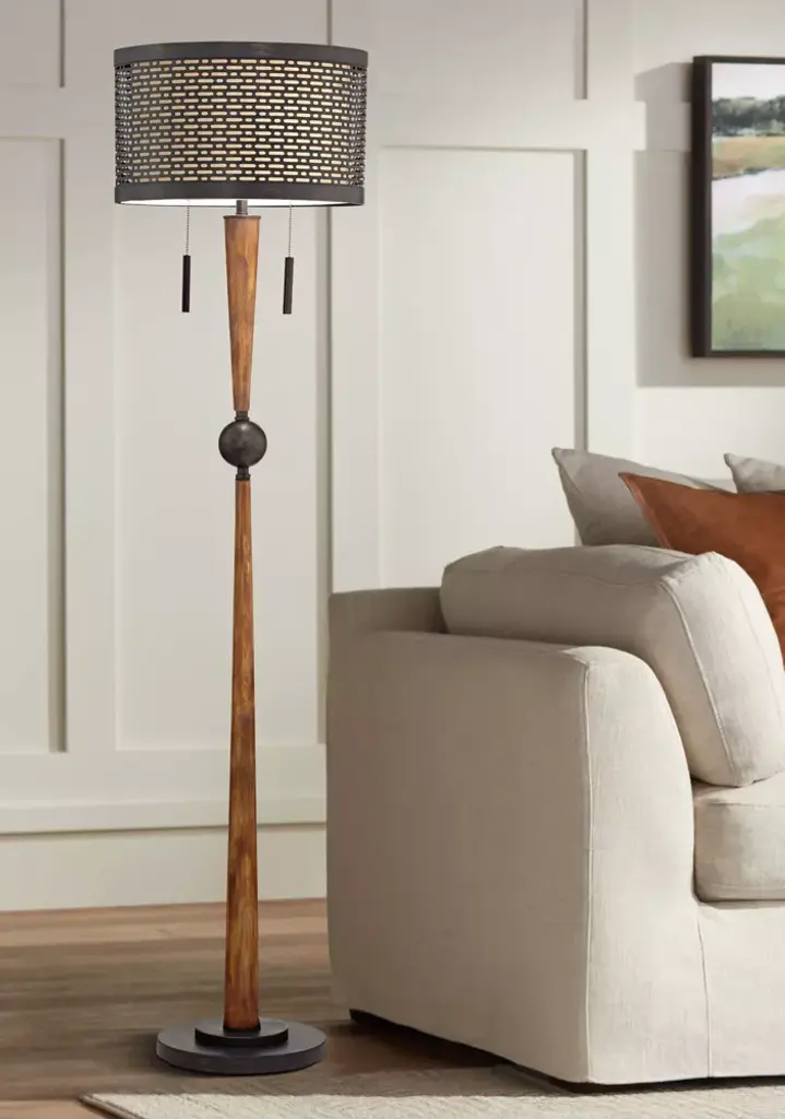 Vintage inspiration abounds in this upscale retro floor lamp design from Franklin Iron Works. The round base and tapered body display the wood's natural grain, showcasing the blend of organic and industrial materials. Atop the lamp rests a double drum shade design, comprised of a cream linen interior and perforated metal exterior. Dual pull chains allow for adjustable light based on your preferences and needs.