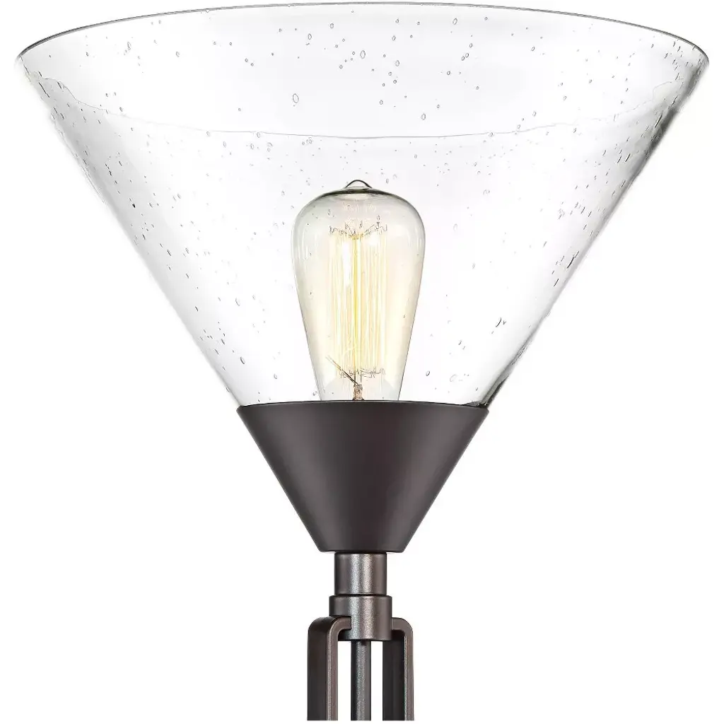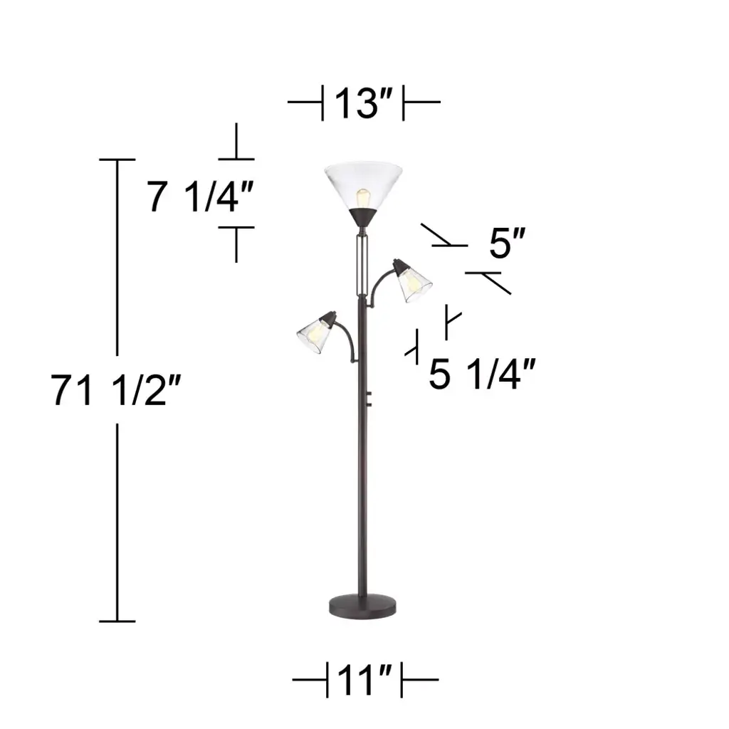Ideal for both task and ambient lighting, this tree torchiere lamp is uniquely stylish. The top light is directed to the ceiling for general overall room lighting. The side lights are ideal for reading or other tasks, and can be adjusted and aimed as needed. The lamp comes in a rich tiger bronze finish and has clear seeded glass shades. Comes complete with LED Edison filament bulbs, but can use other standard-medium base bulbs.
