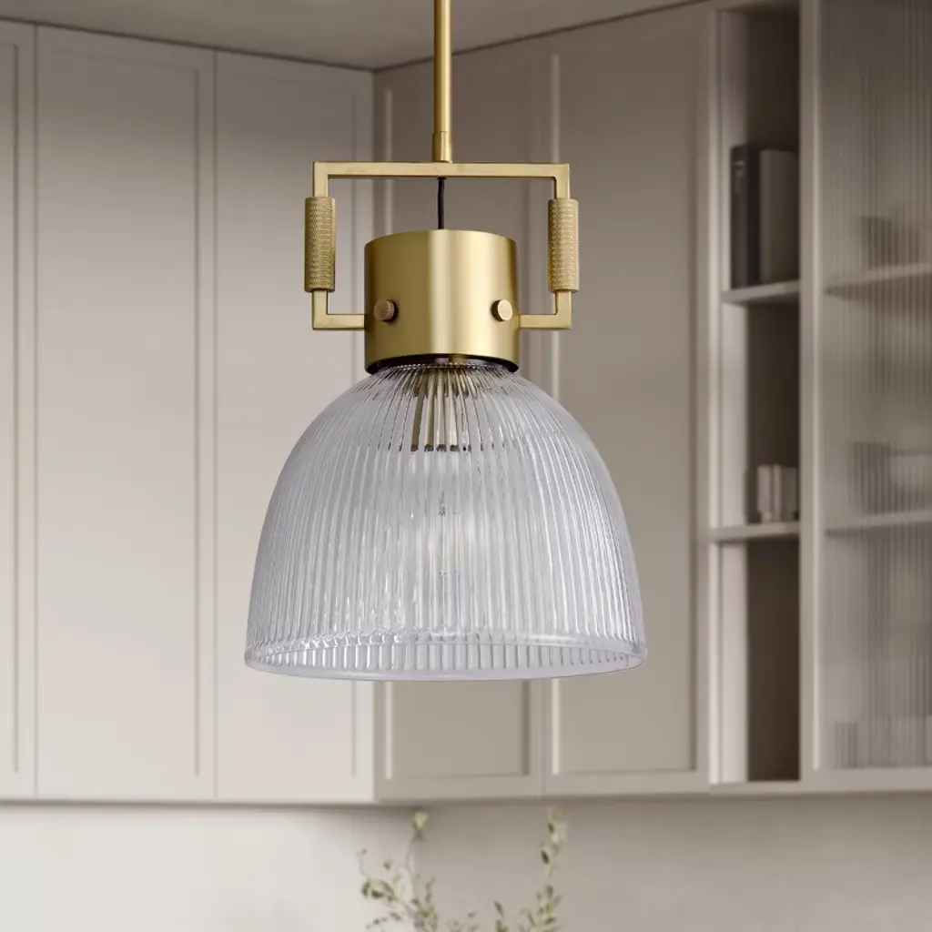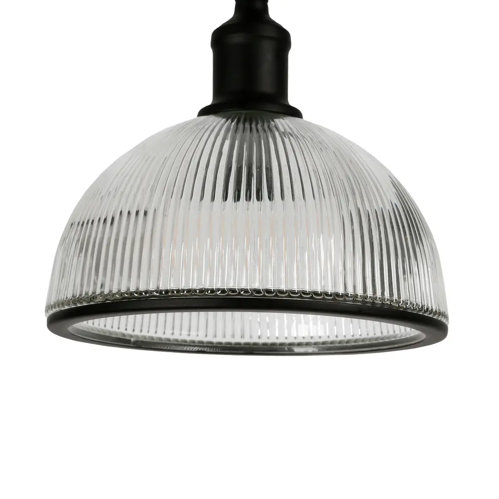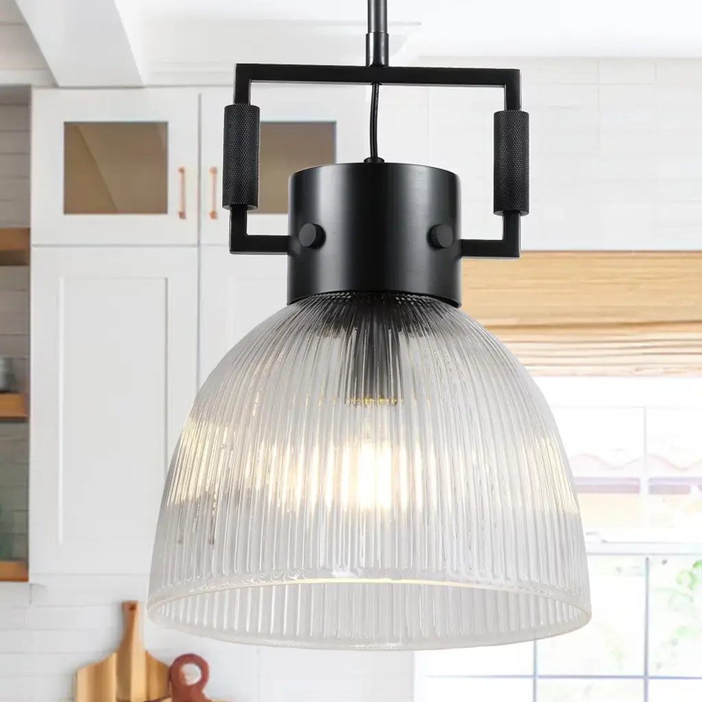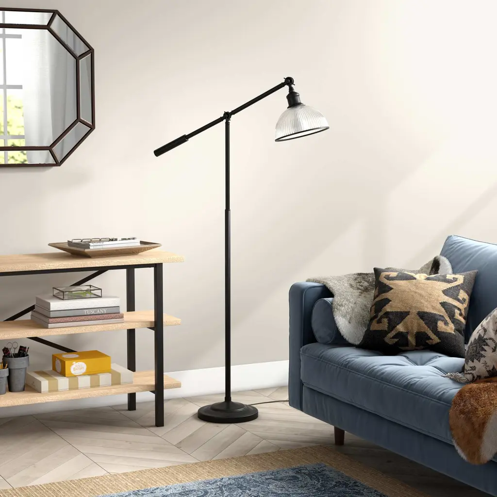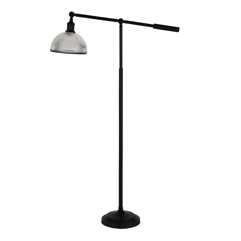 Inspired by modern farmhouse design, this height-adjustable floor lamp features a clean metal body culminating into a dome shade made from ribbed glass. Its adjustable swing arm and lamp head allow you to cast light where you need it most. Use it as a reading light or task light in your living room, bedroom or office and watch how it transforms the space! Features an adjustable swing arm and lamp head to cast light where you need it. Height adjusts from 51" to 58". Paired with a dome shaped shade. The ribbed glass shade has a black lining around the edge of the shade. Rated for one 100W incandescent bulb; 9W LED bulb, 23W fluorescent (CFL) bulb, or 9W self-ballasted LED bulb. E26-base bulb. Includes an 8 ft. cord. Clean with a soft, dry cloth; no harsh chemicals or abrasive cleaning materials.