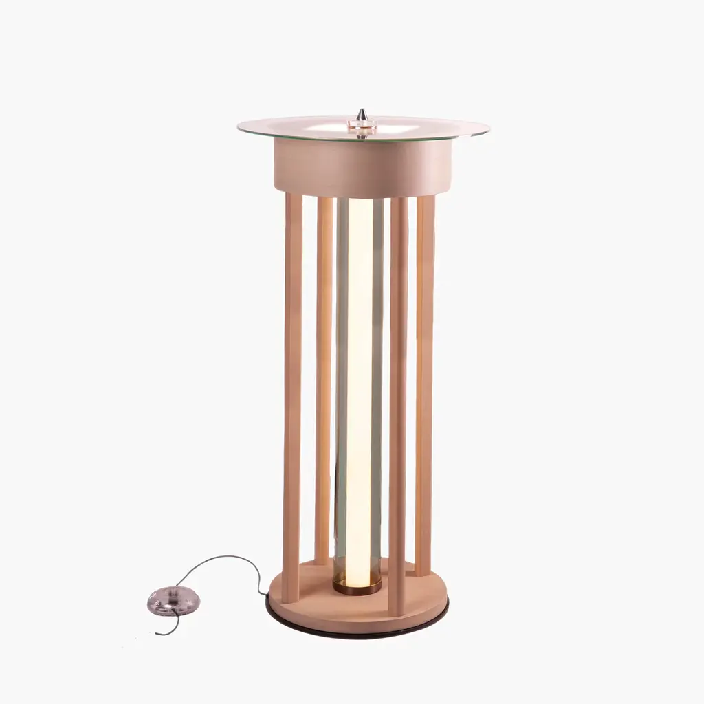 The wooden floor lamp elegantly merges design with nature, featuring clean lines that accentuate the natural beauty of beech wood. With a durable pyrex tube and a stylish glass top, complemented by satin brass finishes, it adds a modern touch to any space. Perfect for brightening living rooms or bedrooms, this lamp combines functionality with aesthetic appeal, making it an ideal addition to your home decor. The bulb is not included.