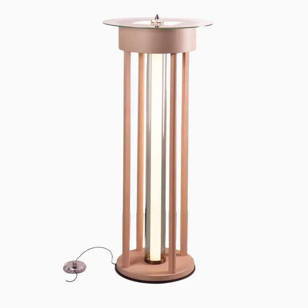 The wooden floor lamp beautifully merges design with nature, showcasing clean lines that highlight the natural elegance of beech wood. Featuring a durable pyrex tube and a chic glass top, along with satin brass finishes, it adds a sophisticated touch to any room. Ideal for illuminating living spaces or bedrooms, this lamp offers both style and functionality, enhancing your decor with its organic charm. The bulb is not included.