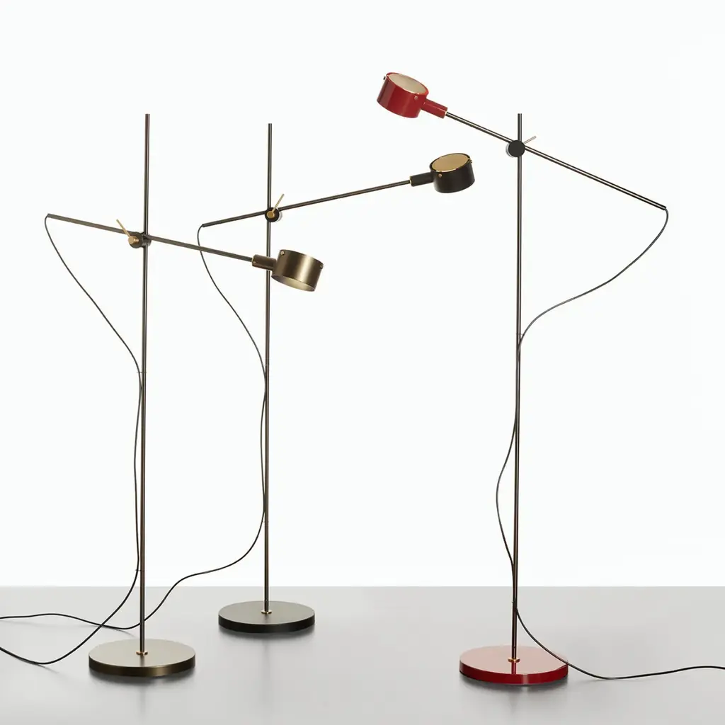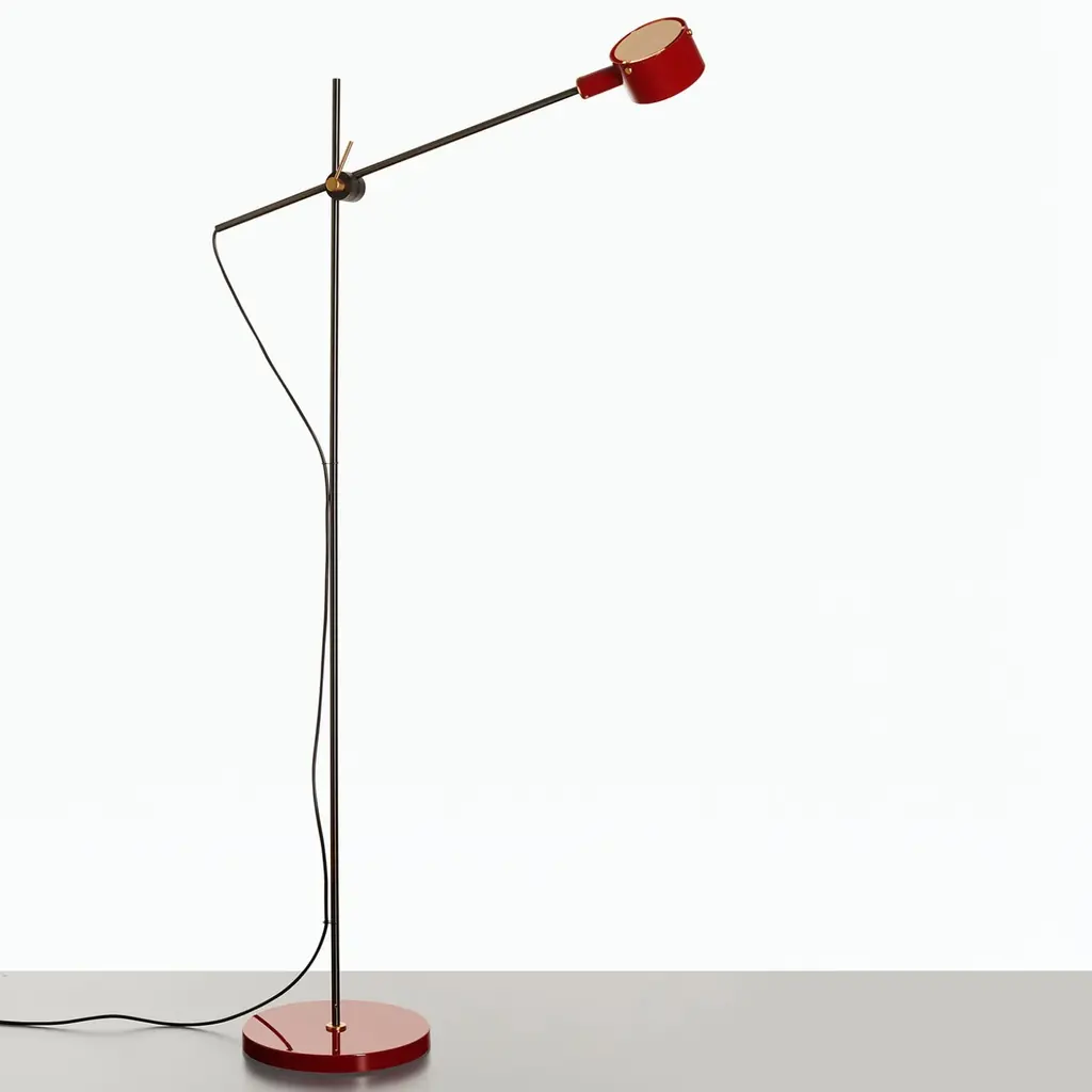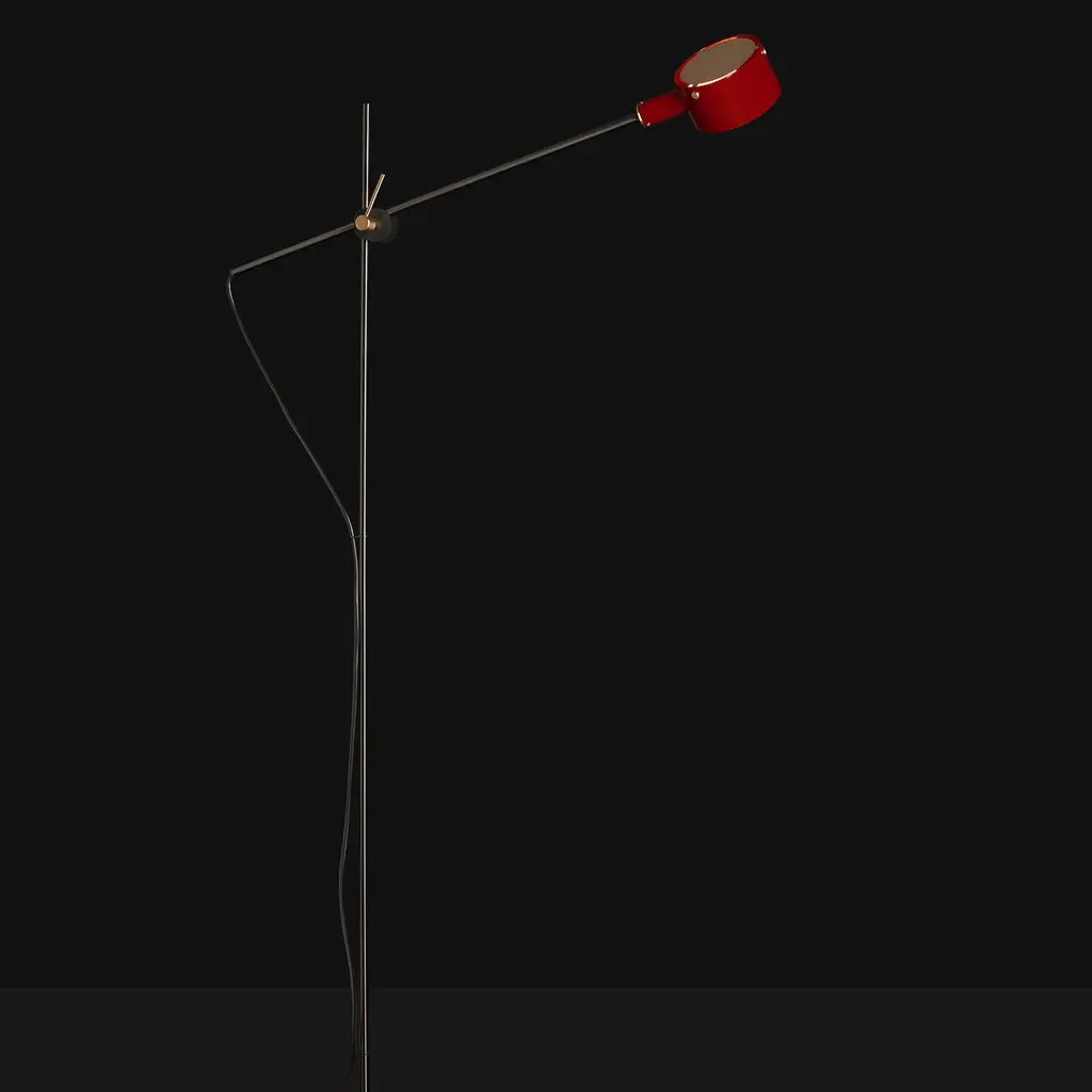 Extending a brilliant 1960s Oluce model by Giuseppe Ostuni, G.O. Floor Lamp seems even more relevant today with the shifting boundaries of work and home life. Mounted on a vertical stem, the horizontal arm with the lampshade can easily be positioned for maximum effect, sliding and angling as needed at the levered joint. The lamp also reflects the vivacious Italian style of the era, with its black-nickel structure and the metal reflector shade and base in matte black, scarlet gloss or satin bronze.