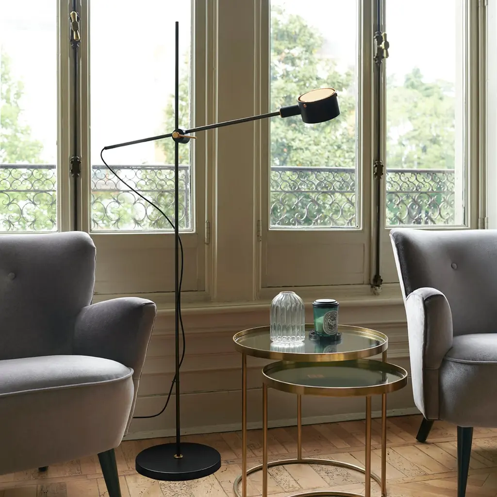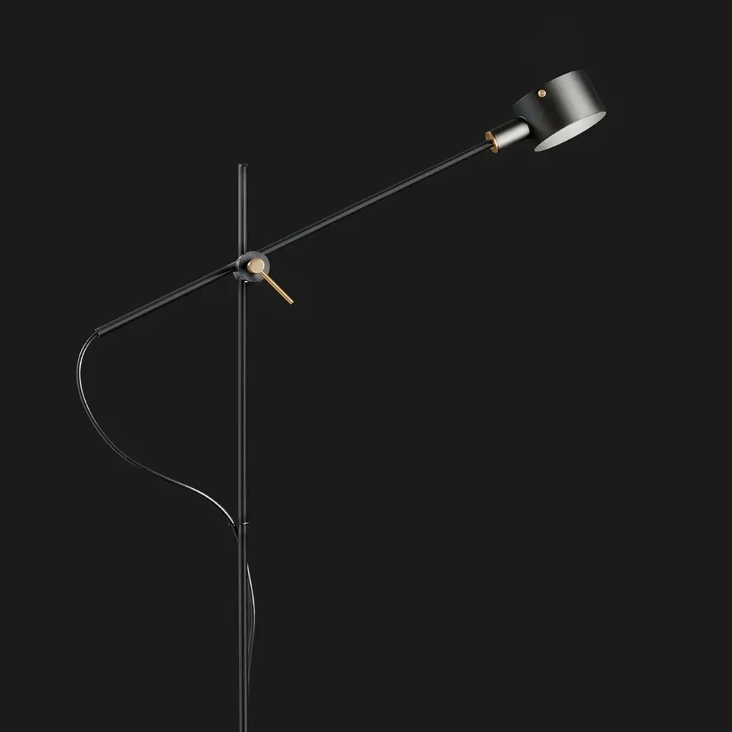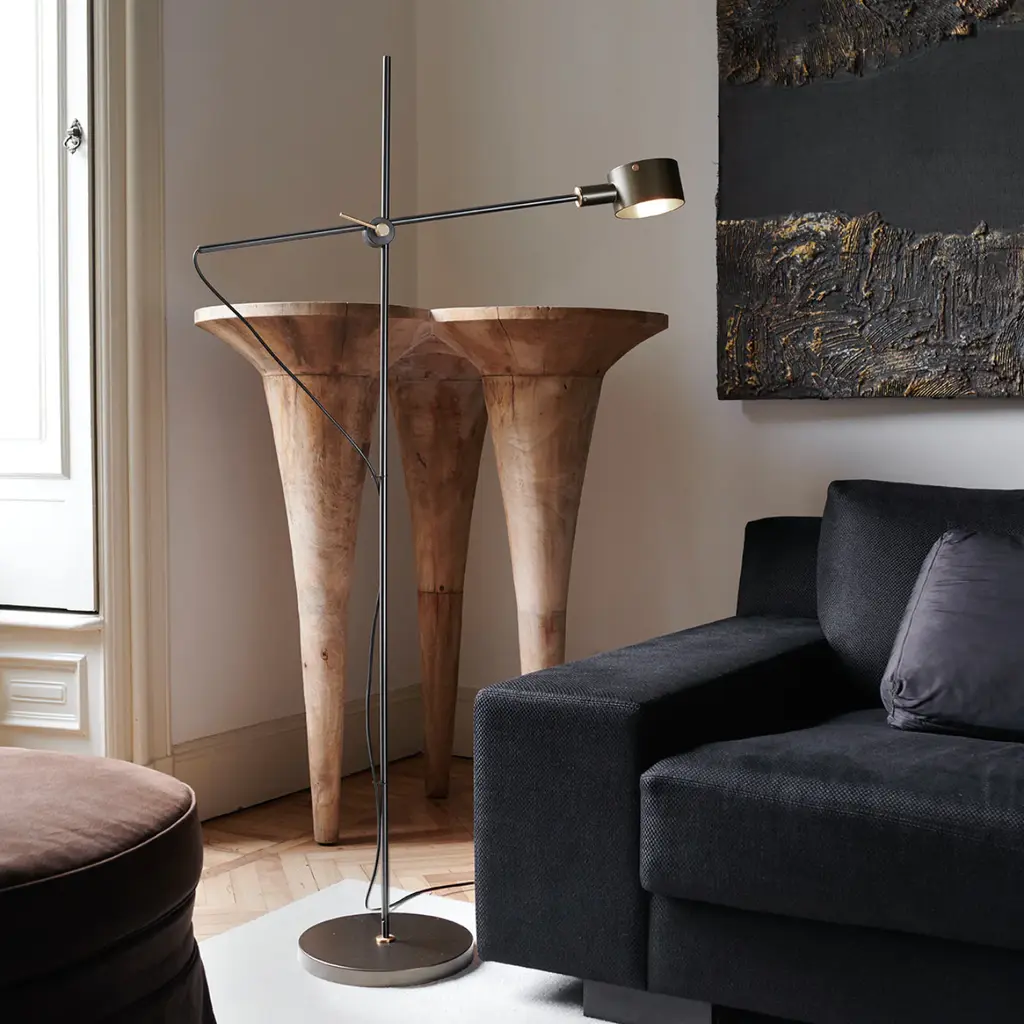 Extending a brilliant 1960s Oluce model by Giuseppe Ostuni, G.O. Floor Lamp seems even more relevant today with the shifting boundaries of work and home life. Mounted on a vertical stem, the horizontal arm with the lampshade can easily be positioned for maximum effect, sliding and angling as needed at the levered joint. The lamp also reflects the vivacious Italian style of the era, with its black-nickel structure and the metal reflector shade and base in matte black, scarlet gloss or satin bronze.