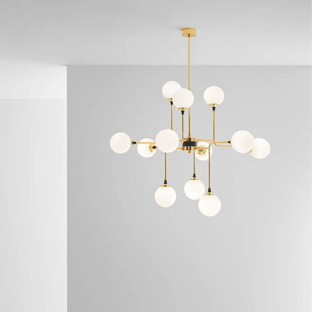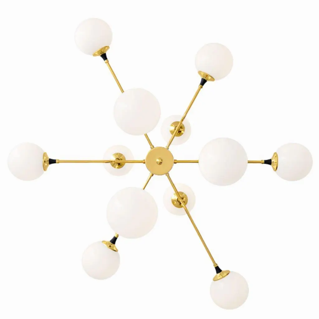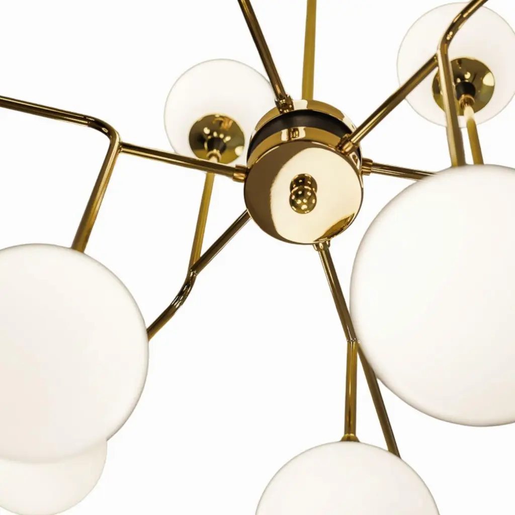 'Galassia' brass & glass 12-shade suspension lamp for StilnovoFounded in 1946 in Milan, Stilnovo was one of the most innovative lighting companies in Italy during the Midcentury era, producing iconic pieces by such luminaries as Joe Colombo, Angelo Mangiarotti, Ettore Sottsass, Gaetano Scolari, Piero Castiglioni, Bruno Gatta and others. Stilnovo was relaunched in 2019 with a commitment to faithfully re-edition its legendary designs with uncompromising attention to detail, materials and craftsmanship.The 1950s charm of the 'Galassia' suspension lamp remains unchanged thanks to the combination of the brass with galvanic gilding on the structure and the white triplex blown glass spheres. A priceless collection that enriches the space with a sophisticated retro touch.Price per item. Available to order in unlimited quantities. Choice of size as a 6-shade or larger 12-shade version. Also available as a floor and wall lamp - please see our separate listings. This listing is for the larger 'Galassia' 12-shade suspension lamp for Stilnovo.In stock lead time 6-8 weeks. Out of stock can add an additional 8 weeks or more. Please note that lead times and inventory availability are subject to change without notice. For time sensitive orders, please contact us for current lead times prior to purchasing.Illuminated via 12x E12 candelabra base bulbs (bulbs not included). Dimmable according to bulbs. Recommended maximum 6 Watt LED bulbs. Suspended from the brass canopy with a maximum overall height of 49.3 inches. IP20 rated. This lamp is UL listed.Made to order.All sales are final.