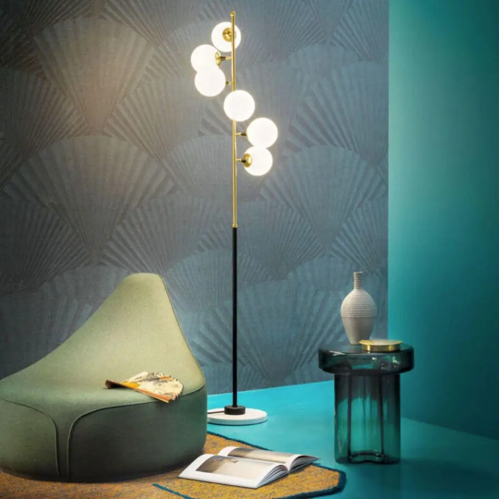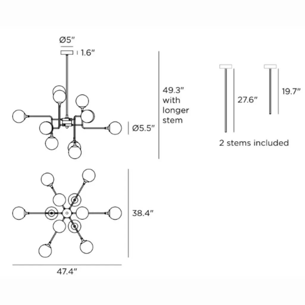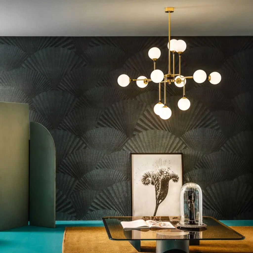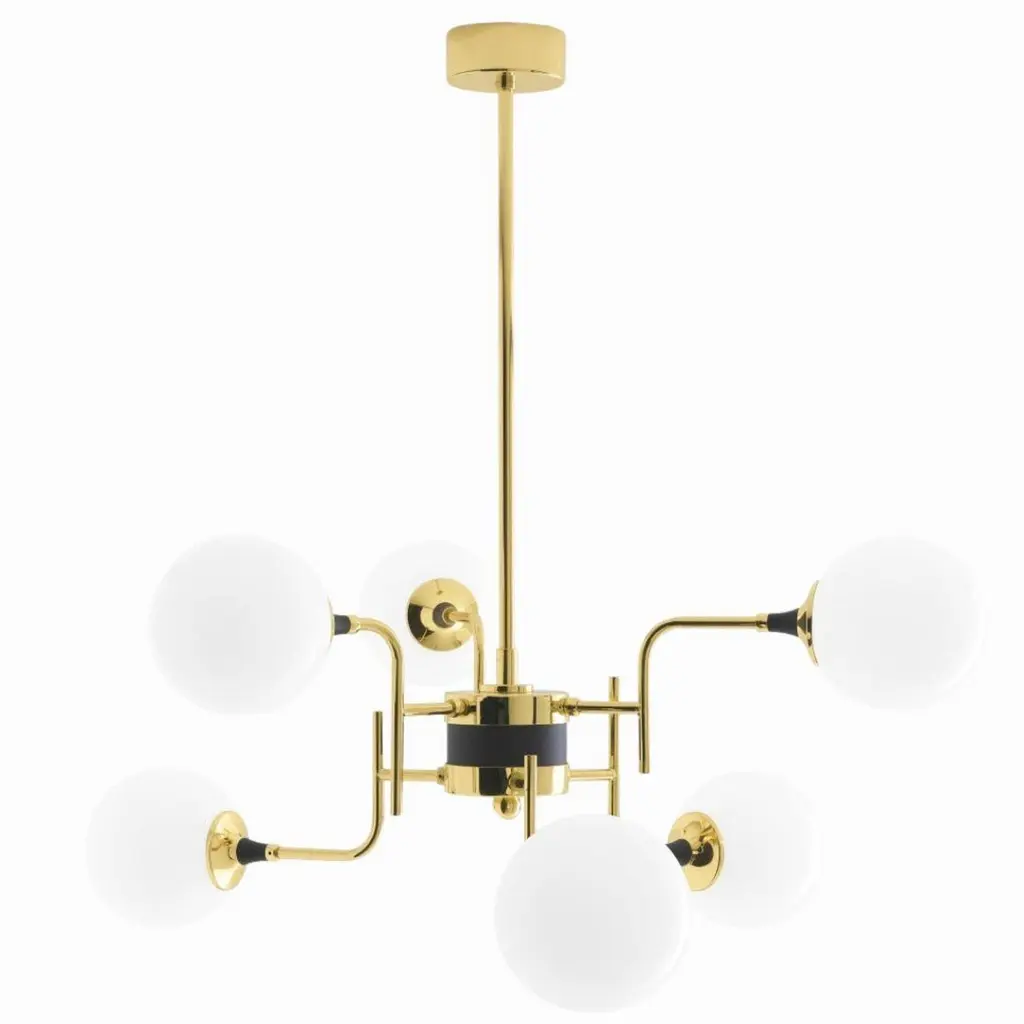 'Galassia' brass & glass 12-shade suspension lamp for StilnovoFounded in 1946 in Milan, Stilnovo was one of the most innovative lighting companies in Italy during the Midcentury era, producing iconic pieces by such luminaries as Joe Colombo, Angelo Mangiarotti, Ettore Sottsass, Gaetano Scolari, Piero Castiglioni, Bruno Gatta and others. Stilnovo was relaunched in 2019 with a commitment to faithfully re-edition its legendary designs with uncompromising attention to detail, materials and craftsmanship.The 1950s charm of the 'Galassia' suspension lamp remains unchanged thanks to the combination of the brass with galvanic gilding on the structure and the white triplex blown glass spheres. A priceless collection that enriches the space with a sophisticated retro touch.Price per item. Available to order in unlimited quantities. Choice of size as a 6-shade or larger 12-shade version. Also available as a floor and wall lamp - please see our separate listings. This listing is for the larger 'Galassia' 12-shade suspension lamp for Stilnovo.In stock lead time 6-8 weeks. Out of stock can add an additional 8 weeks or more. Please note that lead times and inventory availability are subject to change without notice. For time sensitive orders, please contact us for current lead times prior to purchasing.Illuminated via 12x E12 candelabra base bulbs (bulbs not included). Dimmable according to bulbs. Recommended maximum 6 Watt LED bulbs. Suspended from the brass canopy with a maximum overall height of 49.3 inches. IP20 rated. This lamp is UL listed.Made to order.All sales are final.