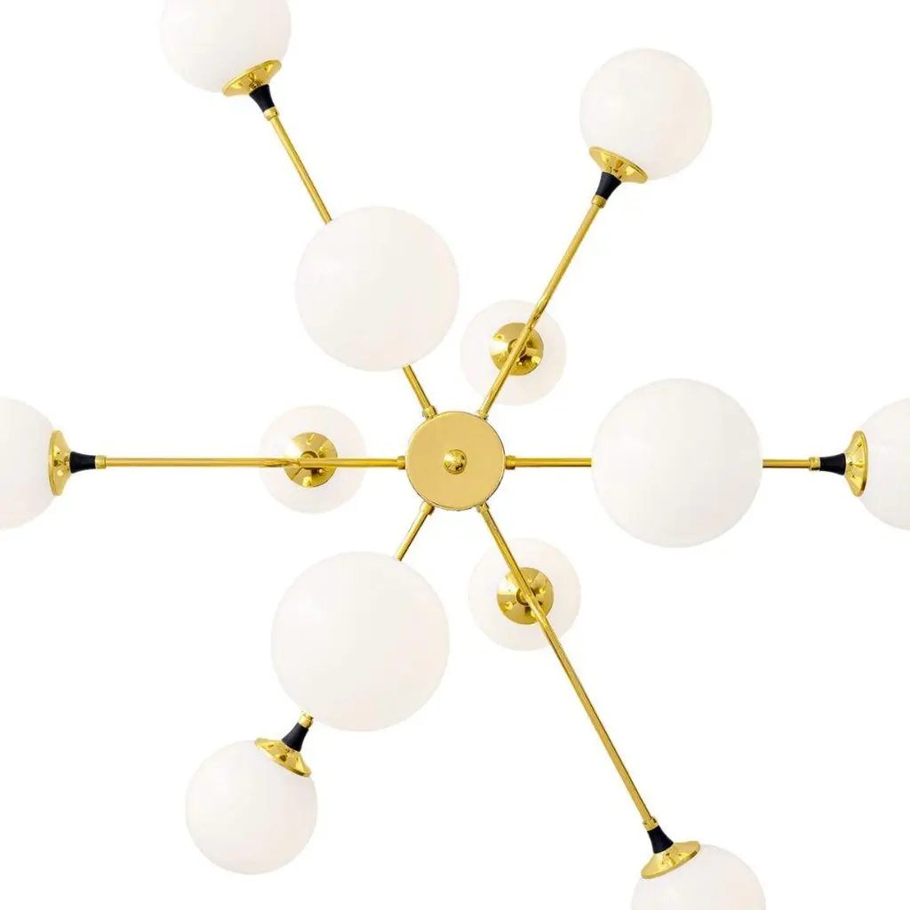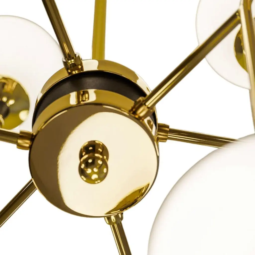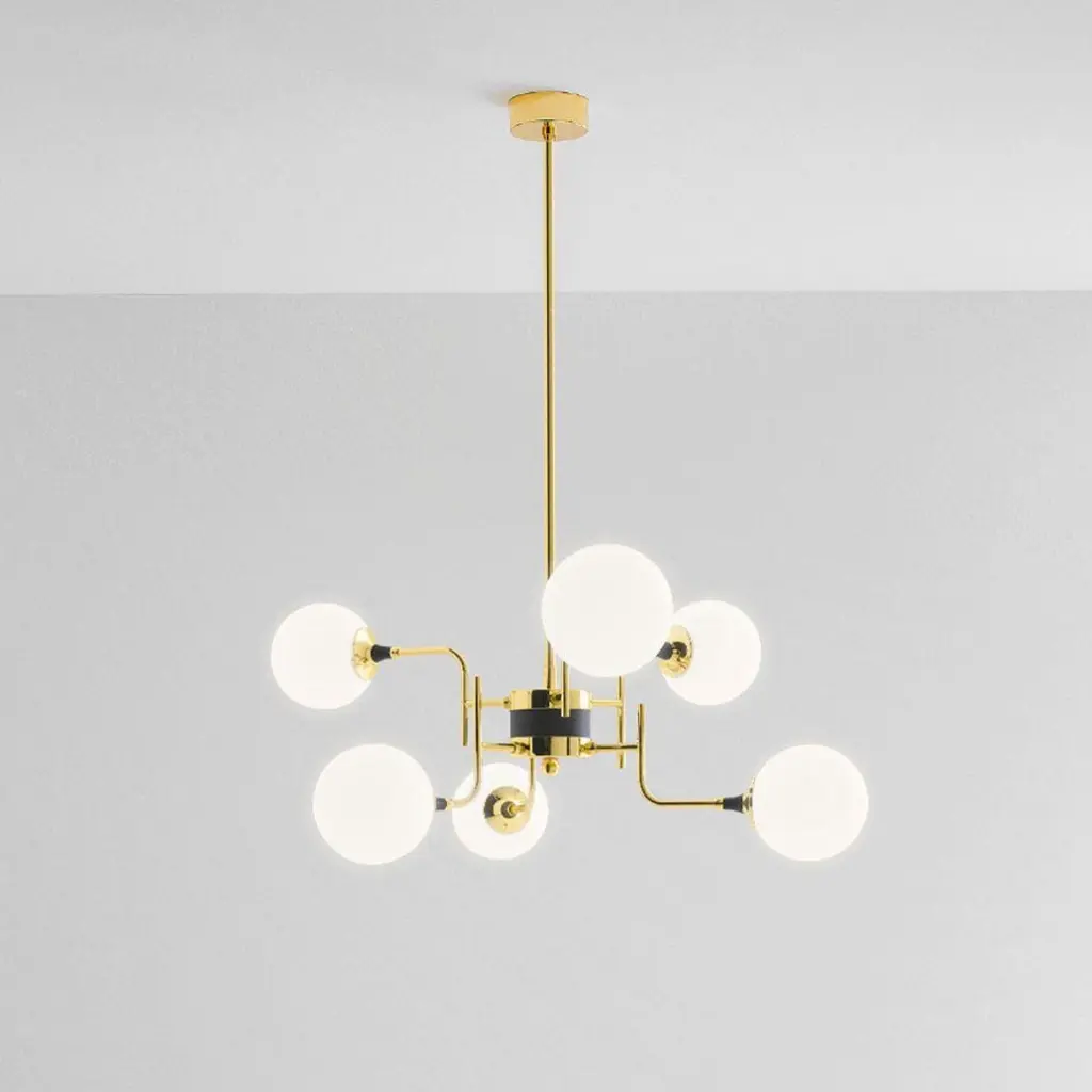 'Galassia' brass & glass 6-shade suspension lamp for StilnovoFounded in 1946 in Milan, Stilnovo was one of the most innovative lighting companies in Italy during the Midcentury era, producing iconic pieces by such luminaries as Joe Colombo, Angelo Mangiarotti, Ettore Sottsass, Gaetano Scolari, Piero Castiglioni, Bruno Gatta and others. Stilnovo was relaunched in 2019 with a commitment to faithfully re-edition its legendary designs with uncompromising attention to detail, materials and craftsmanship.The 1950s charm of the 'Galassia' suspension lamp remains unchanged thanks to the combination of the brass with galvanic gilding on the structure and the white triplex blown glass spheres. A priceless collection that enriches the space with a sophisticated retro touch.Price per item. Available to order in unlimited quantities. Choice of size as a 6-shade or larger 12-shade version. Also available as a floor and wall lamp - please see our separate listings. This listing is for the 'Galassia' 6-shade suspension lamp for Stilnovo.In stock lead time 6-8 weeks. Out of stock can add an additional 8 weeks or more. Please note that lead times and inventory availability are subject to change without notice. For time sensitive orders, please contact us for current lead times prior to purchasing.Illuminated via 6x E12 candelabra base bulbs (bulbs not included). Dimmable according to bulbs. Recommended maximum 6Watt LED bulbs providing 3000 total lumens with CRI 90. IP20 rated. This lamp is UL listed.Made to order.All sales are final.