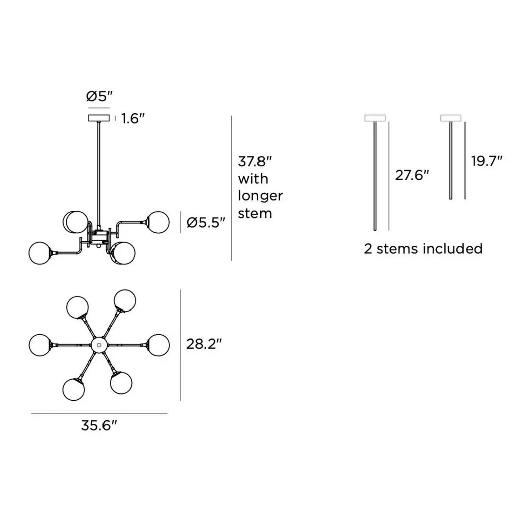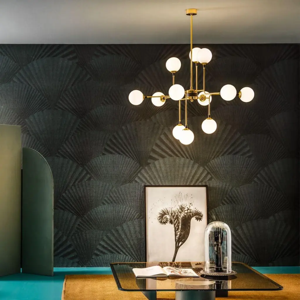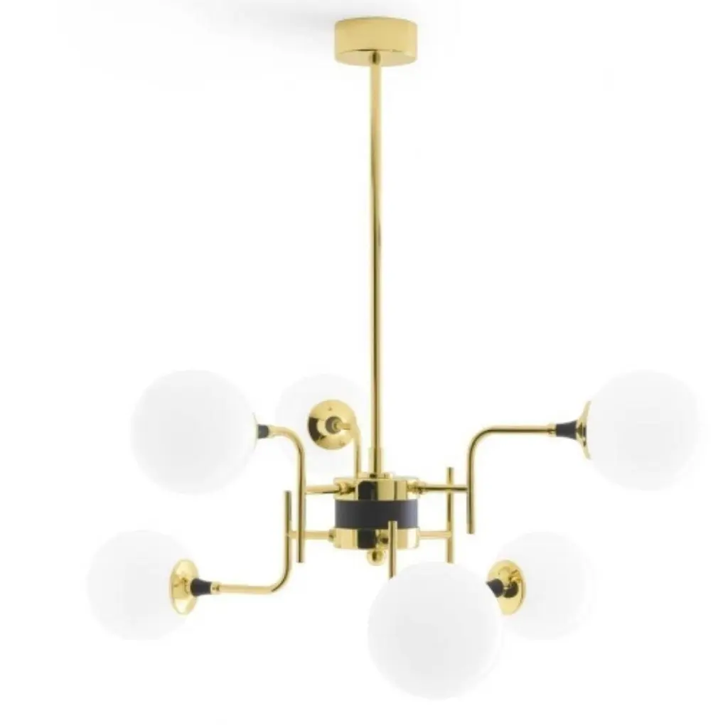 'Galassia' brass & glass 6-shade suspension lamp for StilnovoFounded in 1946 in Milan, Stilnovo was one of the most innovative lighting companies in Italy during the Midcentury era, producing iconic pieces by such luminaries as Joe Colombo, Angelo Mangiarotti, Ettore Sottsass, Gaetano Scolari, Piero Castiglioni, Bruno Gatta and others. Stilnovo was relaunched in 2019 with a commitment to faithfully re-edition its legendary designs with uncompromising attention to detail, materials and craftsmanship.The 1950s charm of the 'Galassia' suspension lamp remains unchanged thanks to the combination of the brass with galvanic gilding on the structure and the white triplex blown glass spheres. A priceless collection that enriches the space with a sophisticated retro touch.Price per item. Available to order in unlimited quantities. Choice of size as a 6-shade or larger 12-shade version. Also available as a floor and wall lamp - please see our separate listings. This listing is for the 'Galassia' 6-shade suspension lamp for Stilnovo.In stock lead time 6-8 weeks. Out of stock can add an additional 8 weeks or more. Please note that lead times and inventory availability are subject to change without notice. For time sensitive orders, please contact us for current lead times prior to purchasing.Illuminated via 6x E12 candelabra base bulbs (bulbs not included). Dimmable according to bulbs. Recommended maximum 6Watt LED bulbs providing 3000 total lumens with CRI 90. IP20 rated. This lamp is UL listed.Made to order.All sales are final.