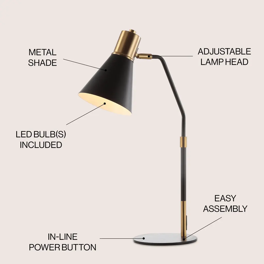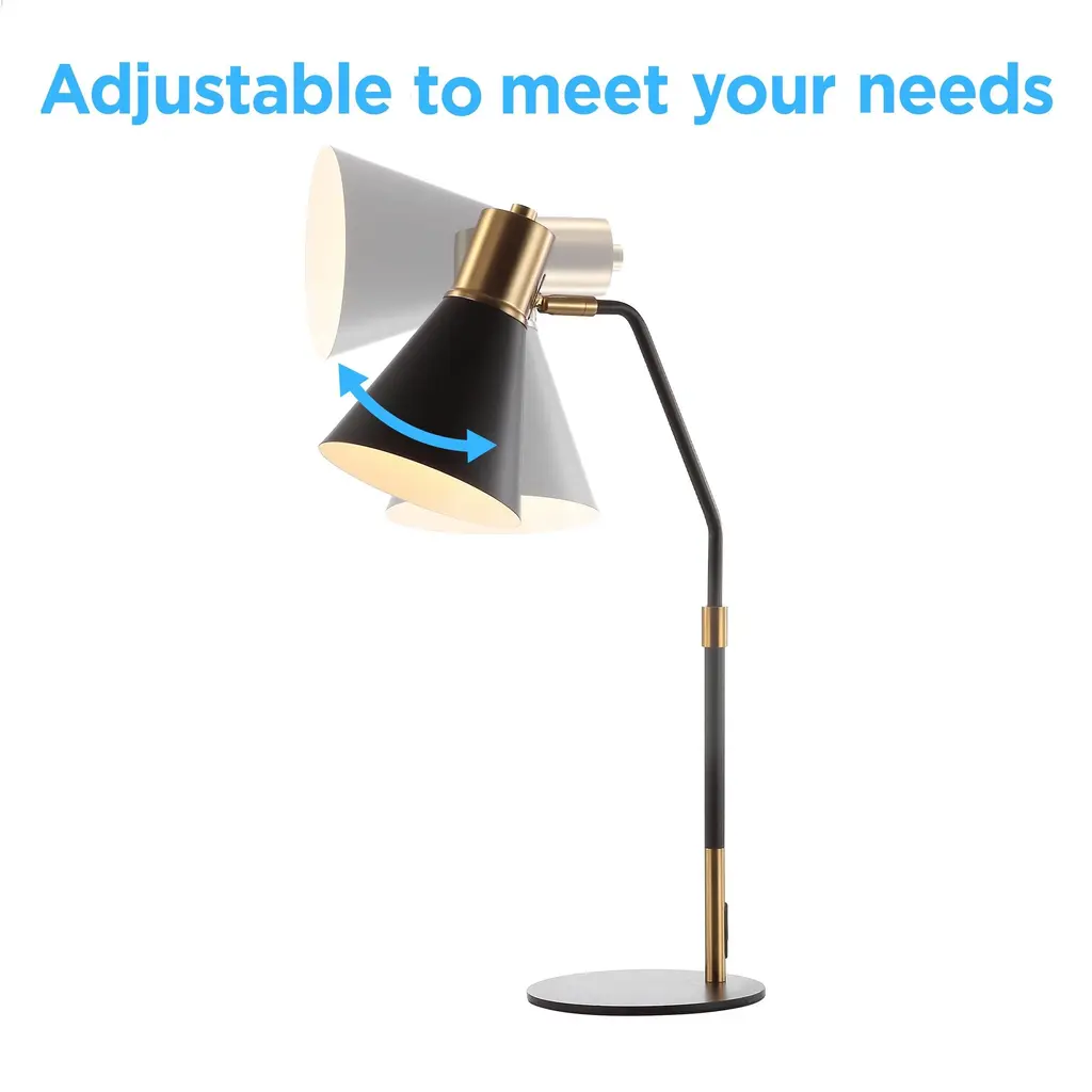 Featuring a cone-shaped shade, this black and brass task lamp is the perfect desk companion whether completing a homework assignment or perusing the newspaper. The design is contemporary and minimalist, while remaining eye catching. The brass accents pair well with the rest of our Apollo series, which registers the currents trends of gold tone hardware and geometric shapes. Features:Dimensions:About us:You see a lamp.We see a decorative work of art.A perfectly curved shade casts a dramatic shadow on a floor. A silk cord you never want to hide. LED lightbulbs: as easy on the environment as they are on the eyes. The JONATHAN Y Lighting collection considers every detail from impeccably sourced materials to designer styling. And our prices are so attractive, we've transformed a functional necessity into a fashion accessory.JONATHAN Y Lighting - a fashion revolution in home decor.